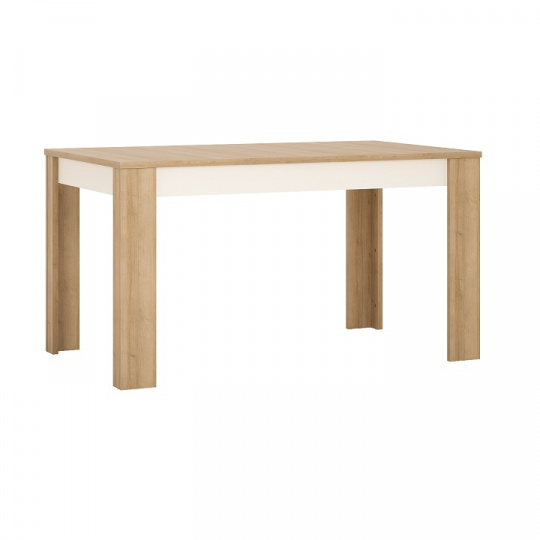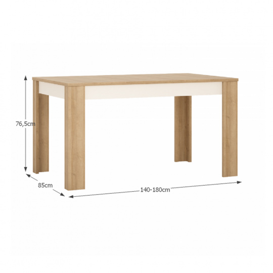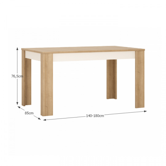 Rozkládací jídelní stůl LYOT03 ze sektorového systému LEONARDO v provedení dub riviera / bílá s extra vysokým leskem Rozměry (ŠxHxV): 140-180x85x76,5 cm Tloušťka materálu: 22 mm Dodávané v demontu