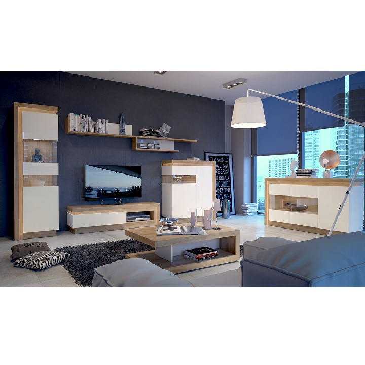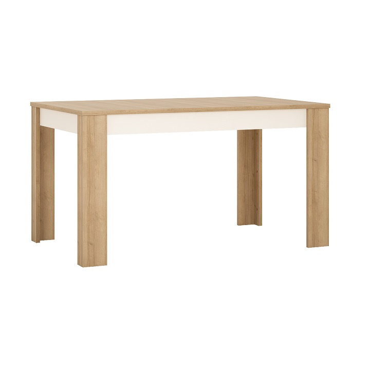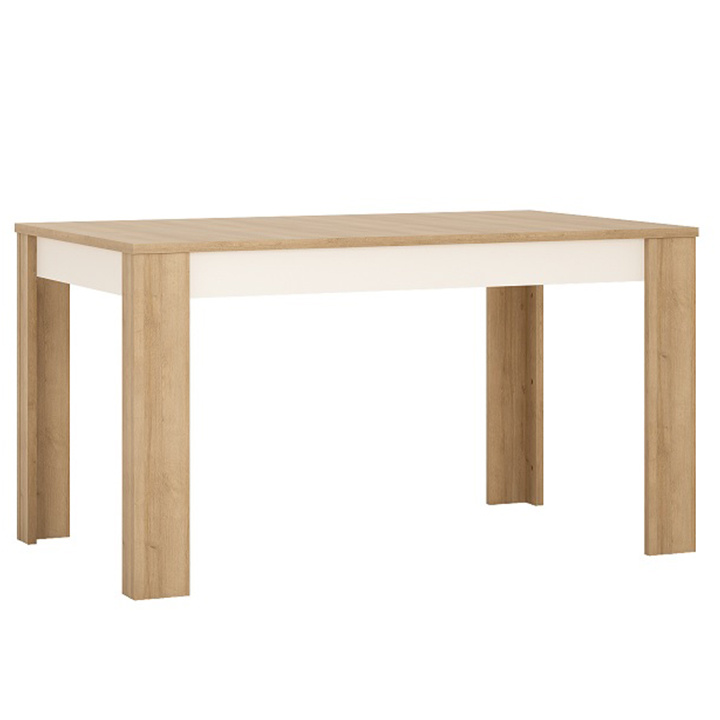 Rozkládací jídelní stůl LYOT03 ze sektorového systému LEONARDO v provedení dub riviera / bílá s extra vysokým leskem Rozměry (ŠxHxV): 140-180x85x76,5 cm Tloušťka materálu: 22 mm Dodávané v demontu