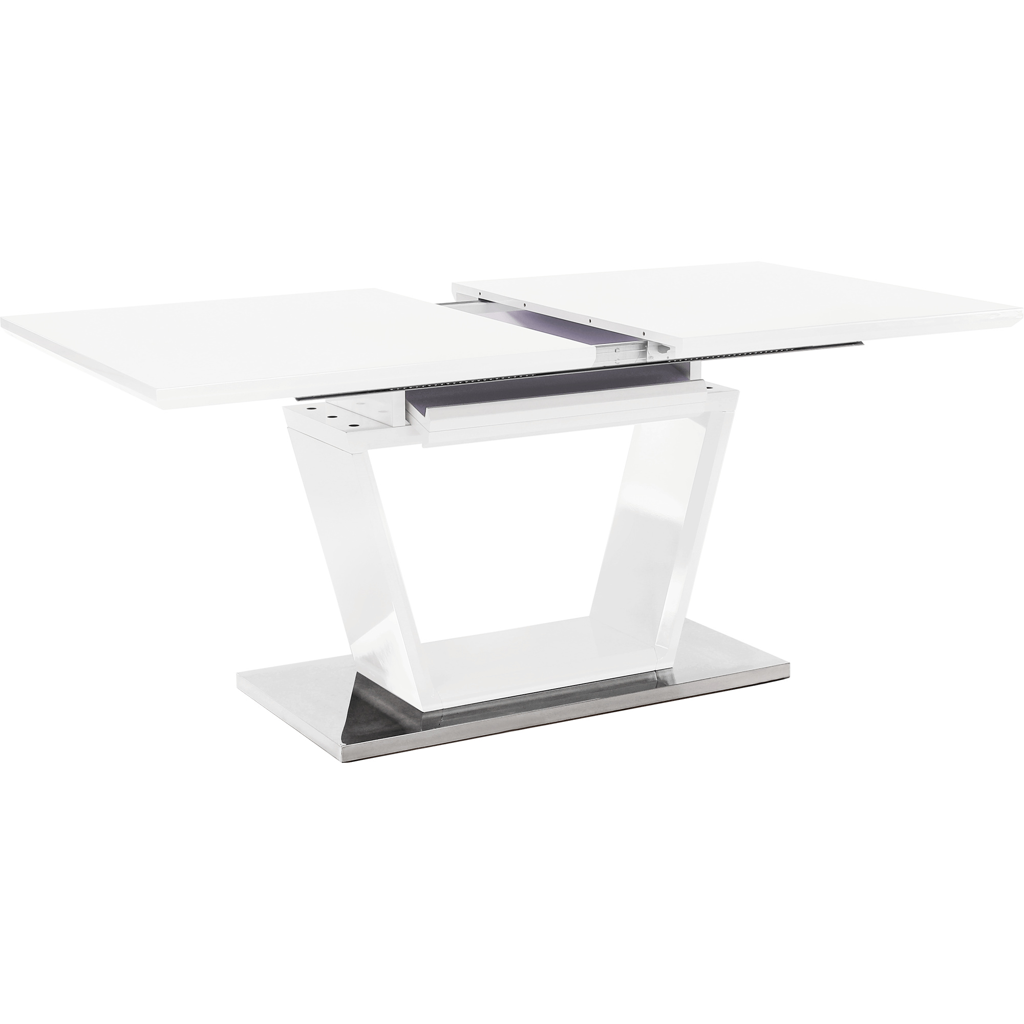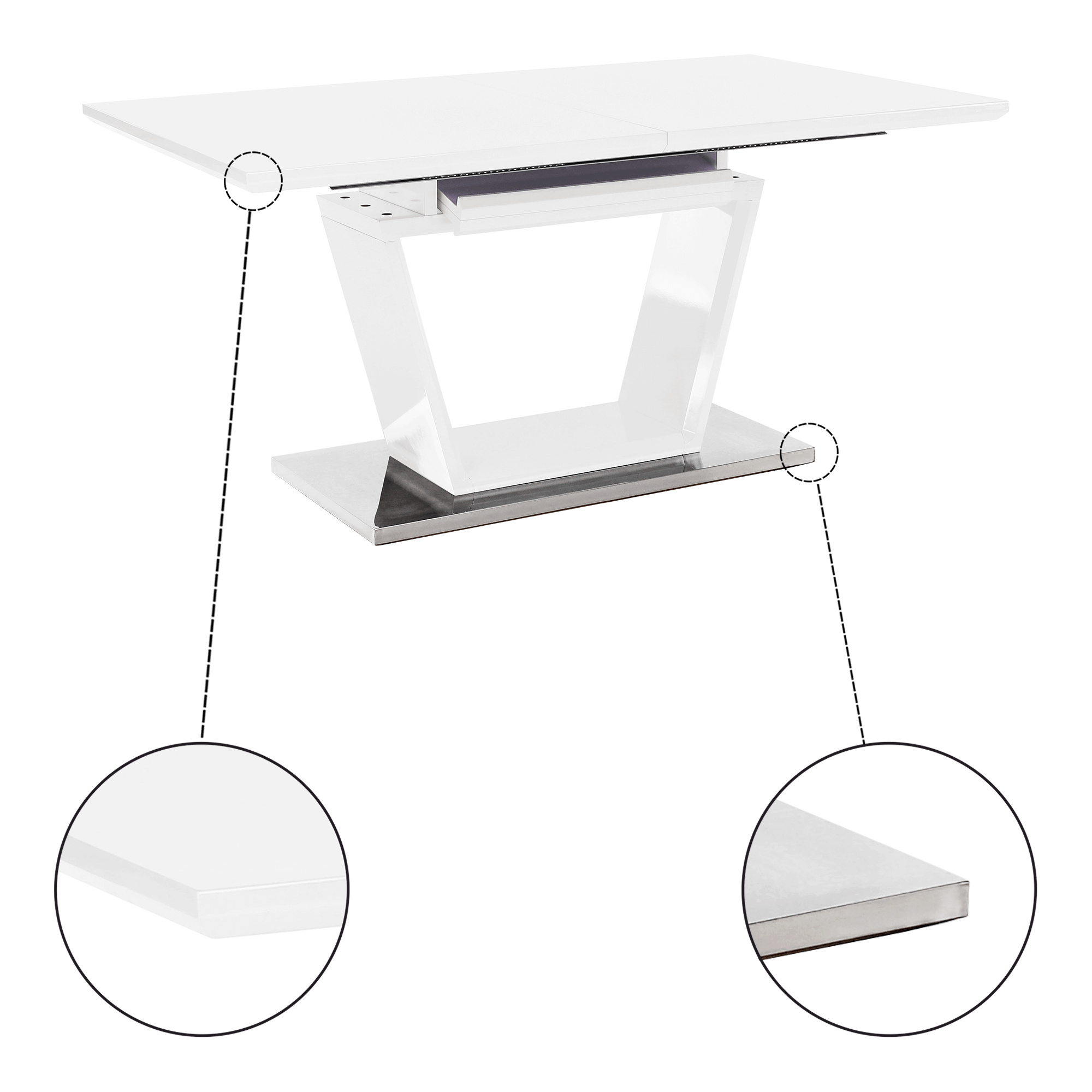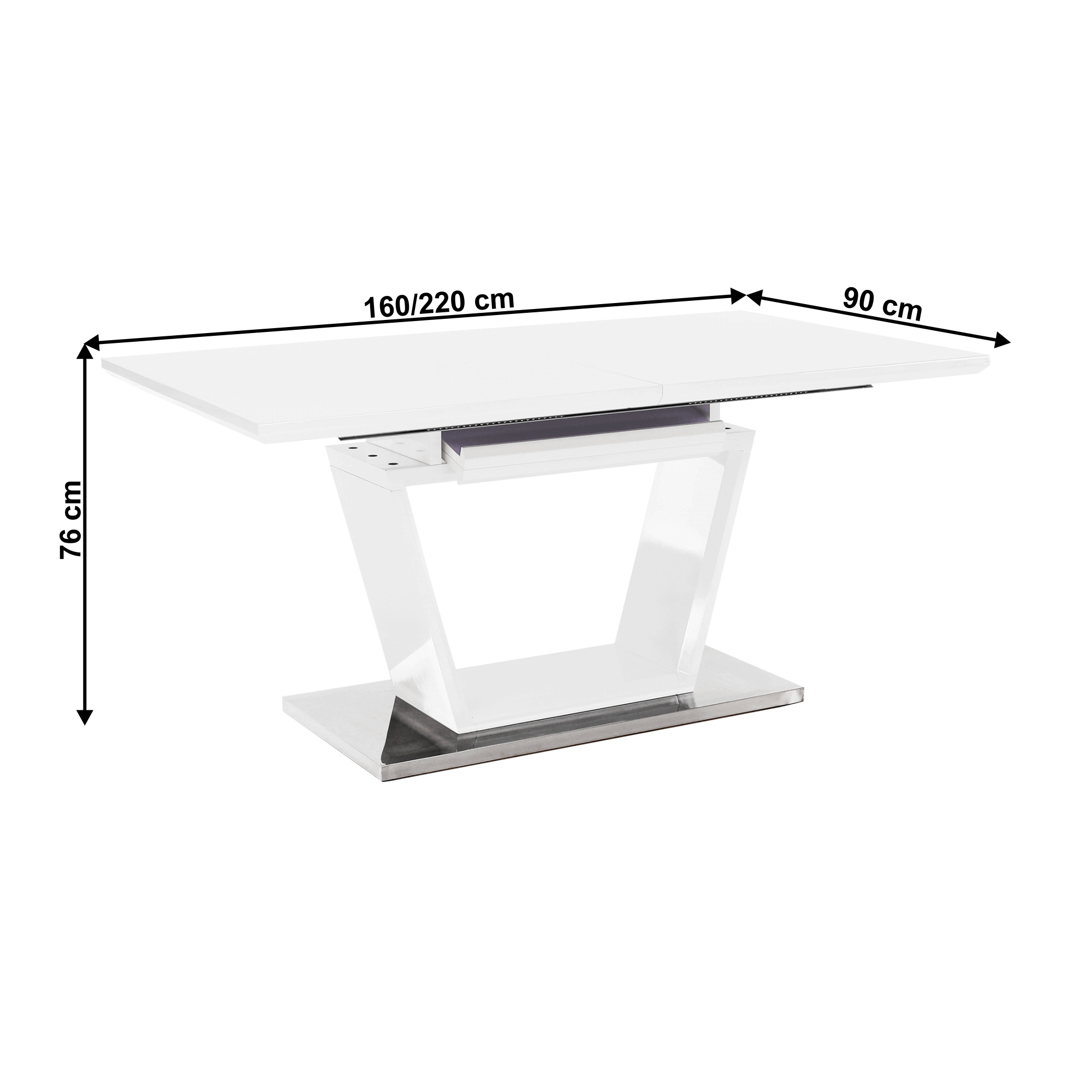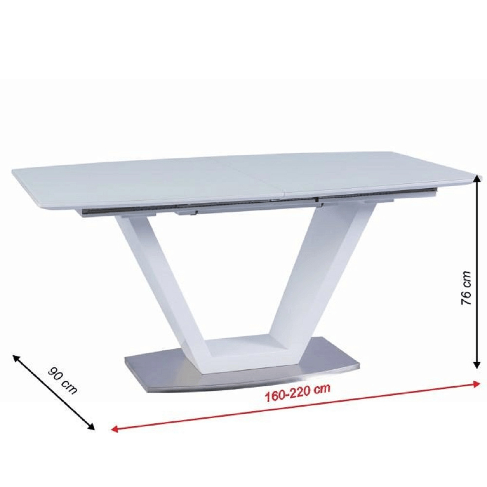 luxusní a designový rozkládací jídelní stůl, barevné provedení: bílá s extra vysokým leskem HG, materiál: MDF + oceľ, ŠxHxV: 160-220x90x76 cm. Vrchní část: 40 mm Spodní část: 30 mm