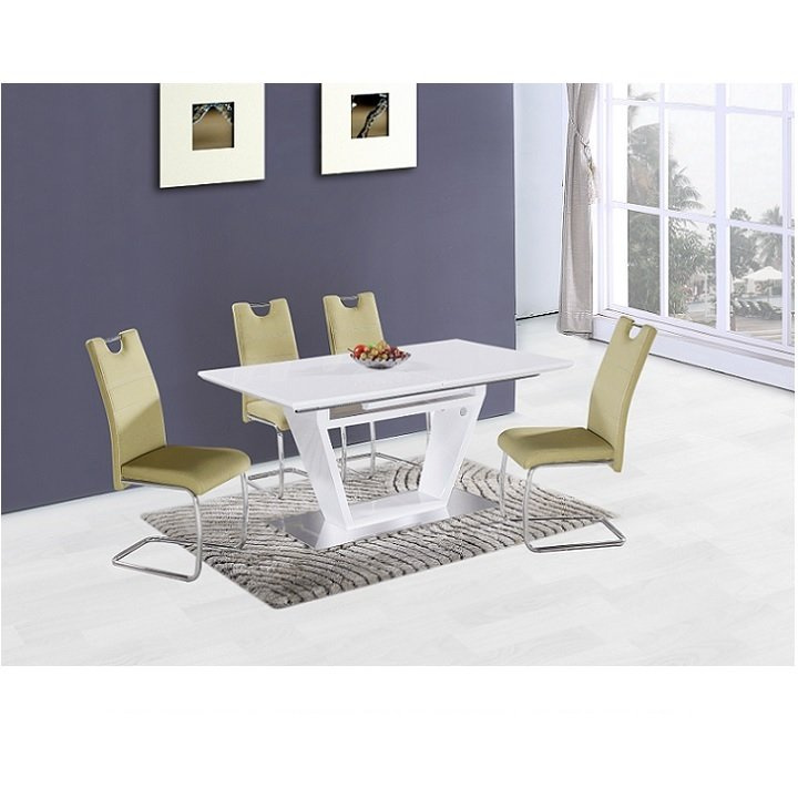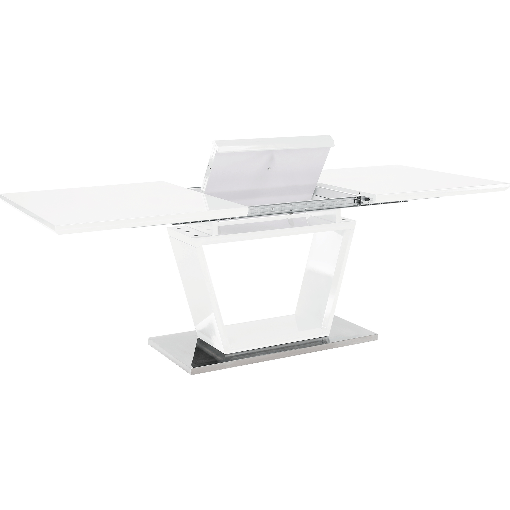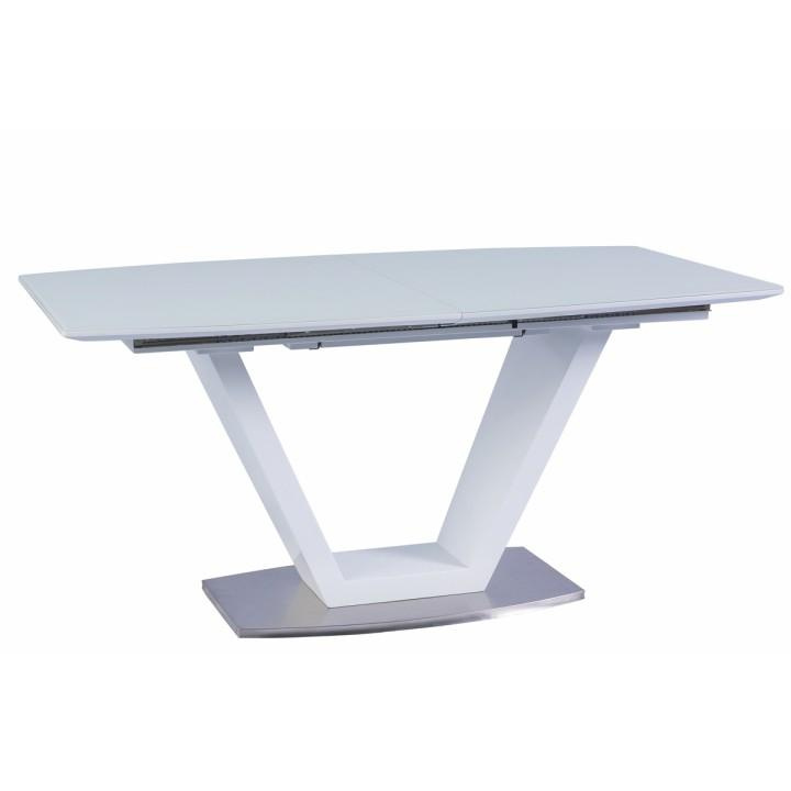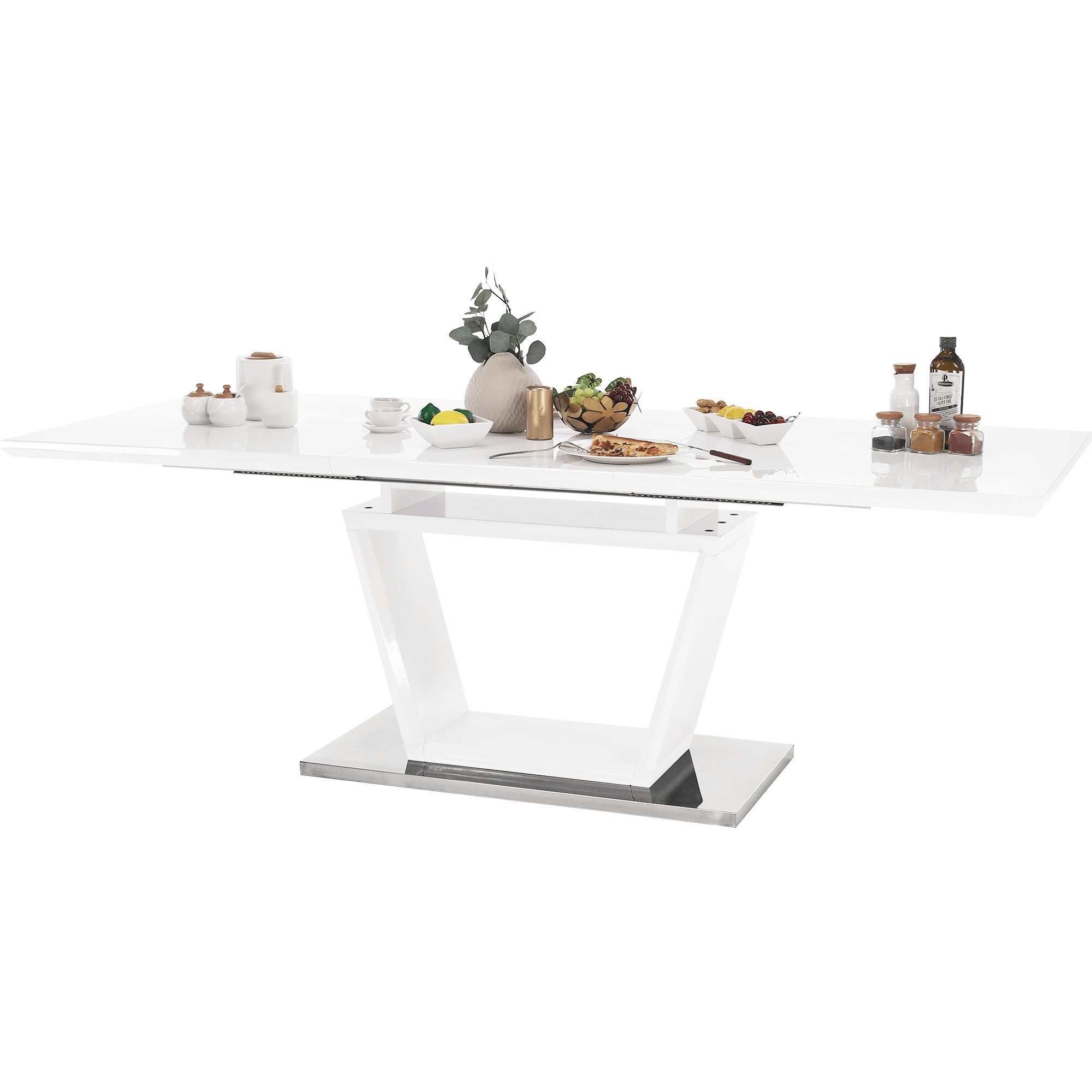 luxusní a designový rozkládací jídelní stůl, barevné provedení: bílá s extra vysokým leskem HG, materiál: MDF + oceľ, ŠxHxV: 160-220x90x76 cm. Vrchní část: 40 mm Spodní část: 30 mm