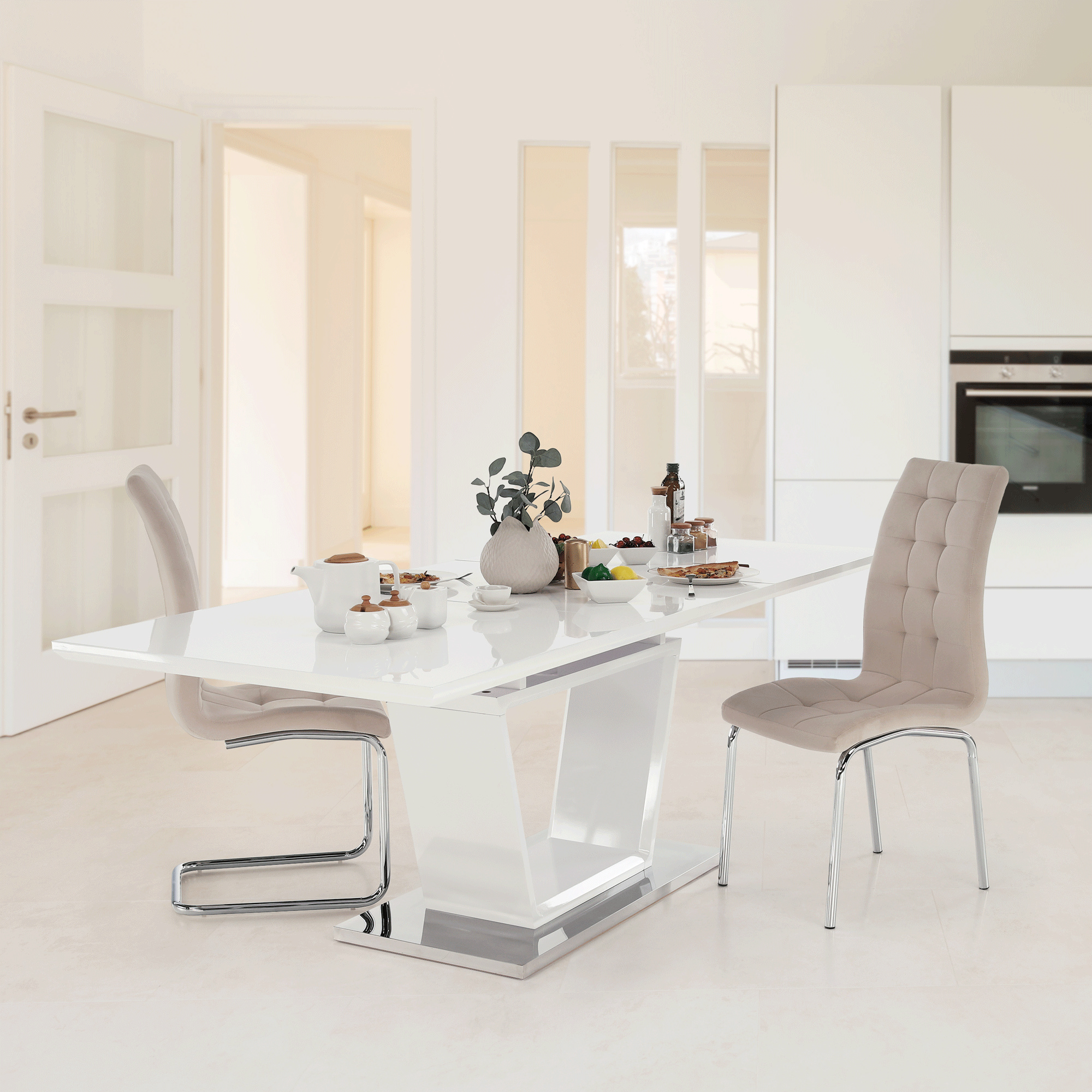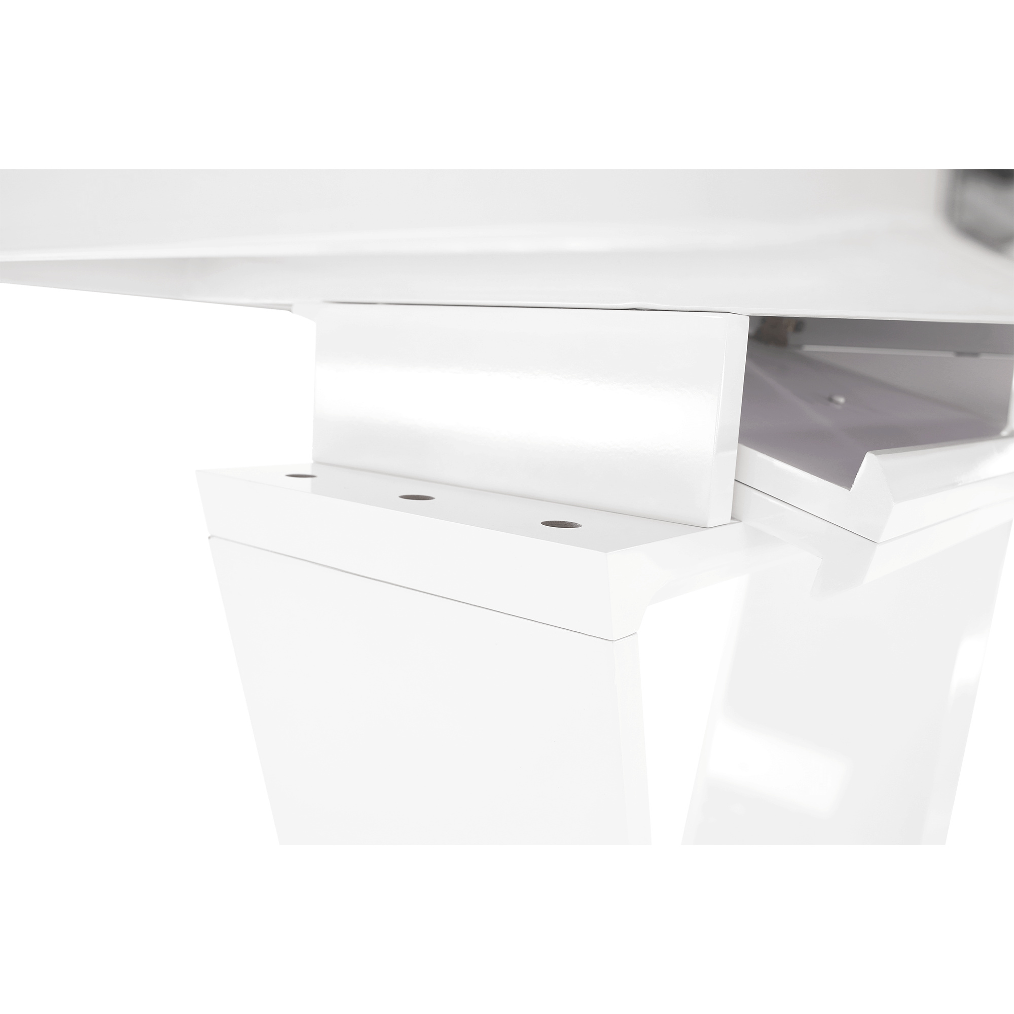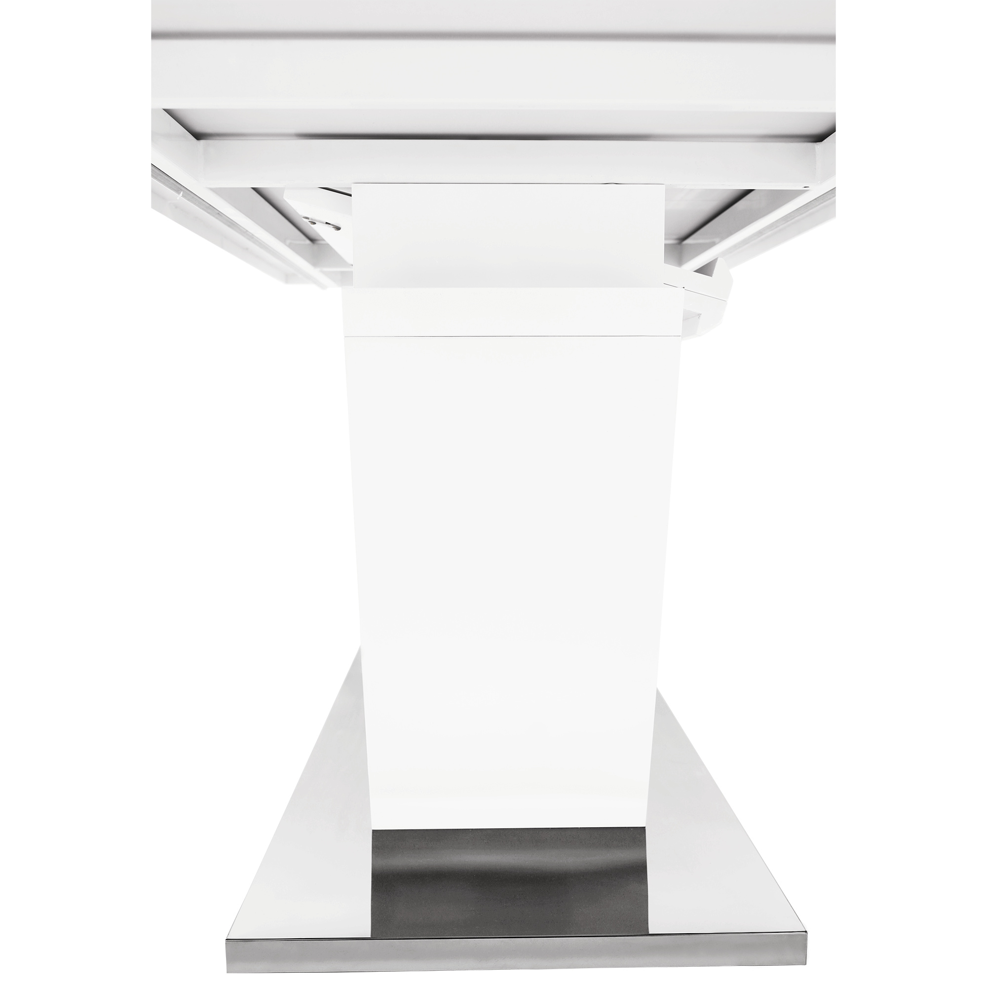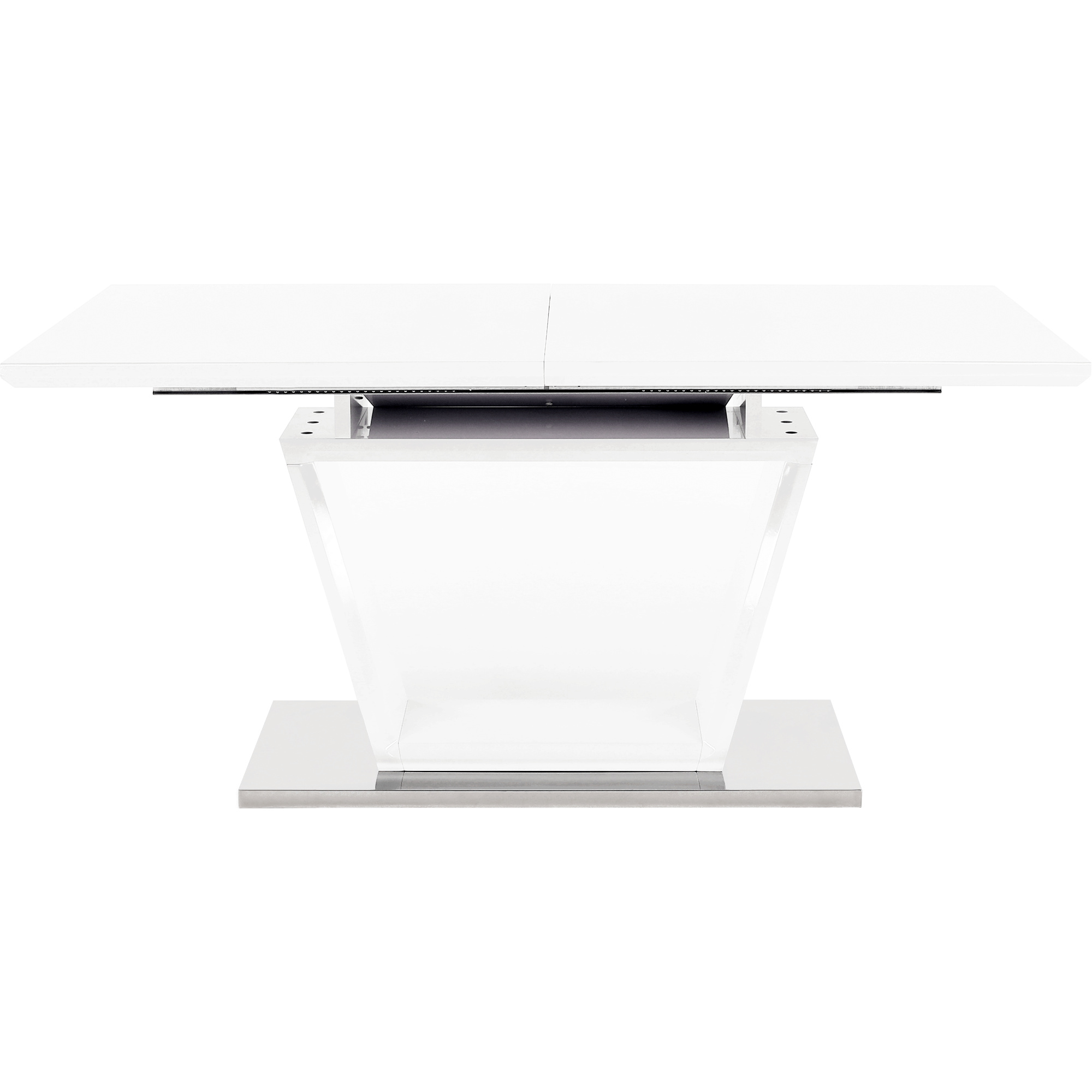 luxusní a designový rozkládací jídelní stůl, barevné provedení: bílá s extra vysokým leskem HG, materiál: MDF + oceľ, ŠxHxV: 160-220x90x76 cm. Vrchní část: 40 mm Spodní část: 30 mm