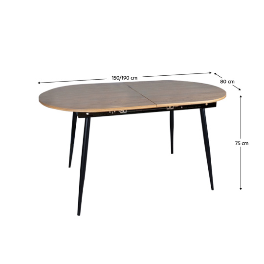 Materiál konstrukce: kov Barva konstrukce: černá Deska stolu: laminovaná MDF Barva: dub Rozměry (ŠxHxV): 150-190x80x75 cm Tloušťka materiálu vrchní desky: 1,8 cm Rozkládací Jednoduchý Klasické provedení Kovové nohy Jednoduchá údržba S kluzáky pro ochranu podlahy Vhodný pro 6-8 osob Nosnost: 50 kg Dodáváno v demontu