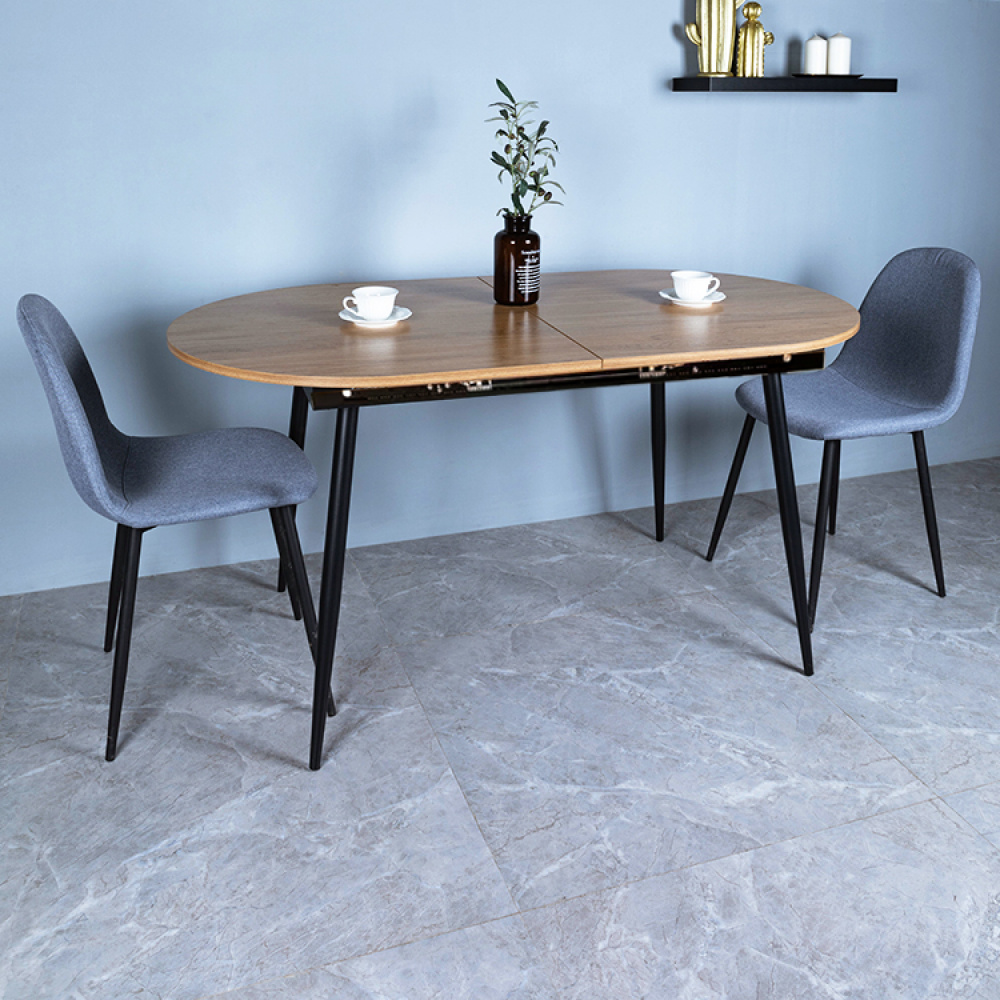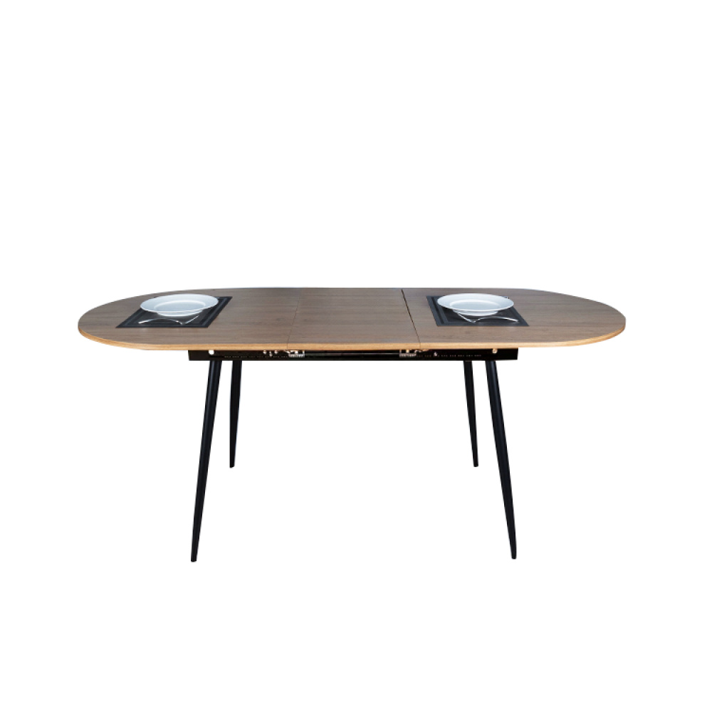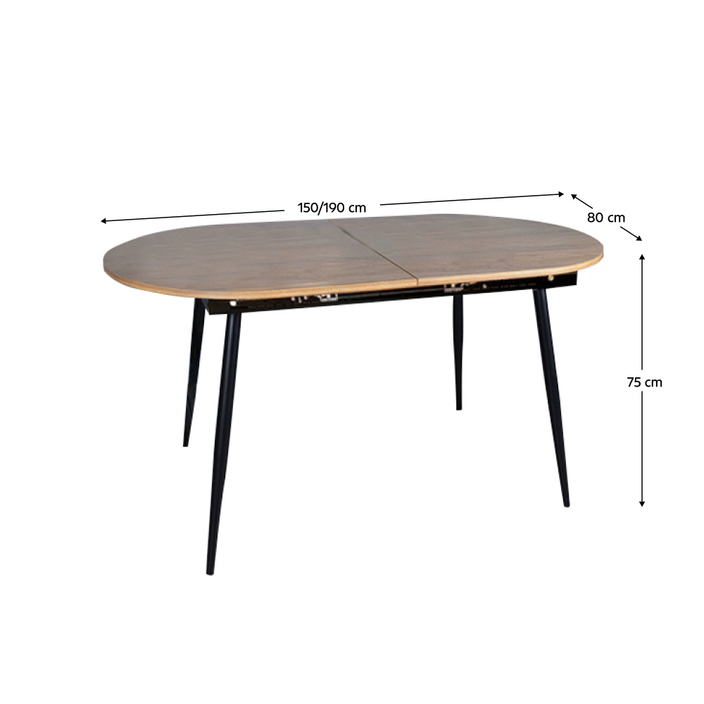 Materiál konstrukce: kov Barva konstrukce: černá Deska stolu: laminovaná MDF Barva: dub Rozměry (ŠxHxV): 150-190x80x75 cm Tloušťka materiálu vrchní desky: 1,8 cm Rozkládací Jednoduchý Klasické provedení Kovové nohy Jednoduchá údržba S kluzáky pro ochranu podlahy Vhodný pro 6-8 osob Nosnost: 50 kg Dodáváno v demontu