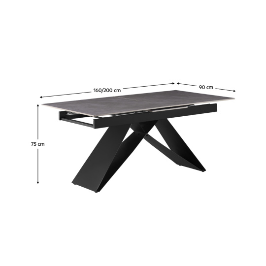 Materiál deska stolu: keramika Barva: beton Konstrukce nohy: kov Barva: černá Rozměry (ŠxHxV): 160-200x90x75 cm Tloušťka materiálu vrchní desky: 1,2 cm Praktický Vhodný pro 6-8 osob Nosnost: 25 kg Dodáváno v demontu