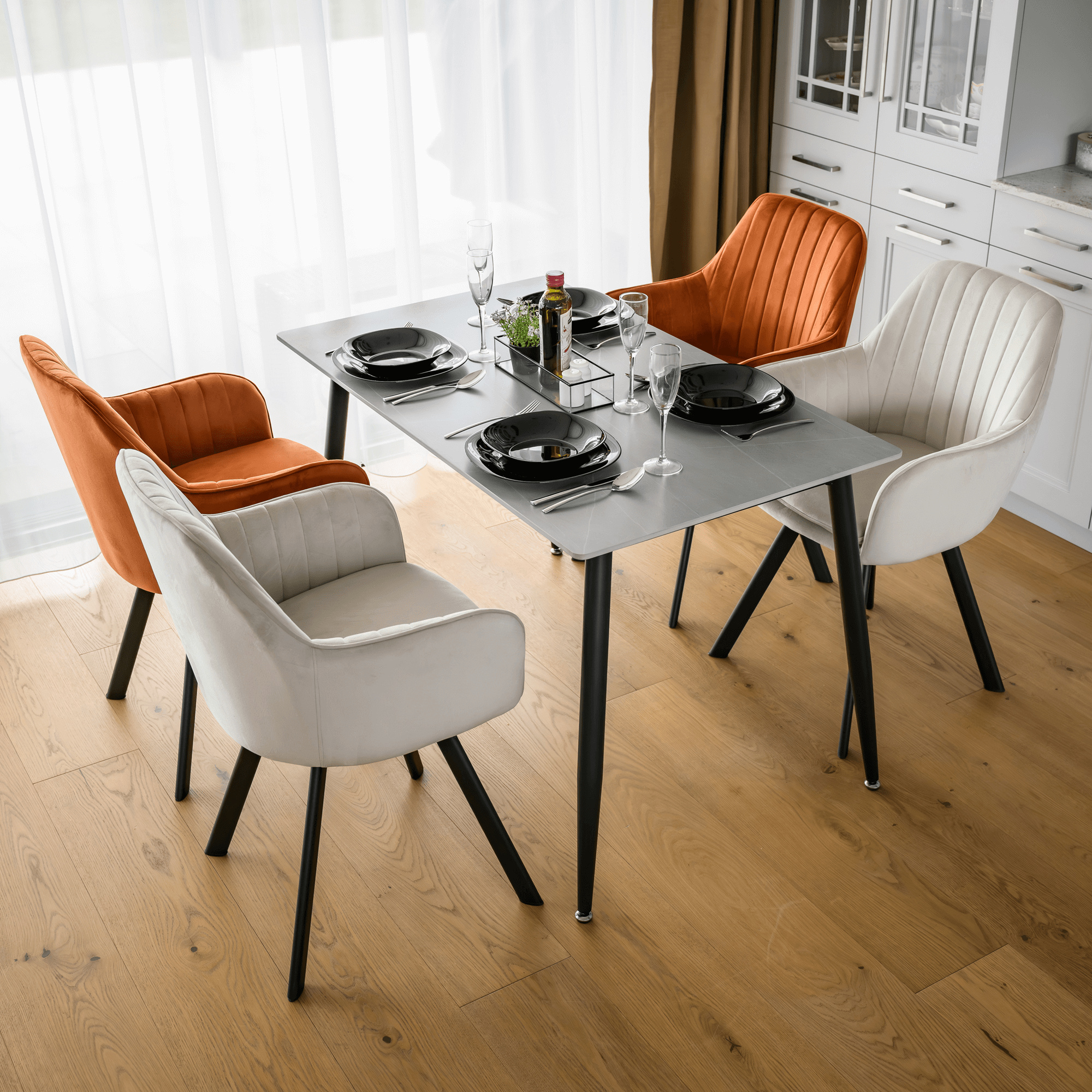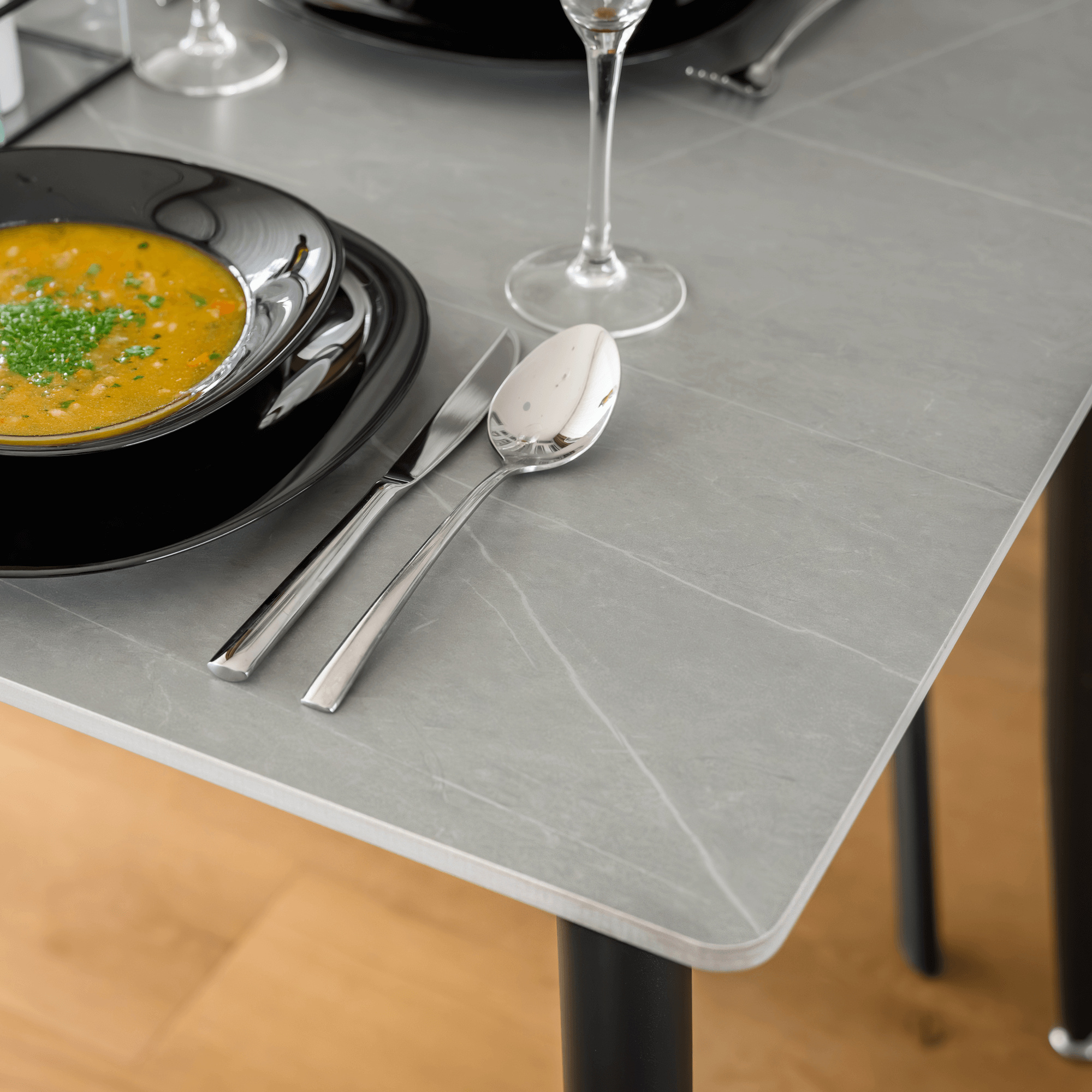 Materiál: kámen/ocel Barva: světlý mramor/černá Rozměry (ŠxHxV): 121x71x73 cm Tloušťka kamenného platu: 1,07 cm Nosnost: 50 kg Praktický Moderní design Vhodný pro 4-6 osob Dodáváno v demontu