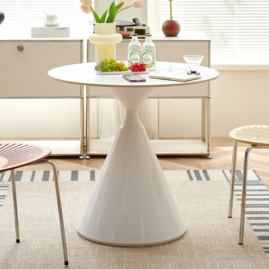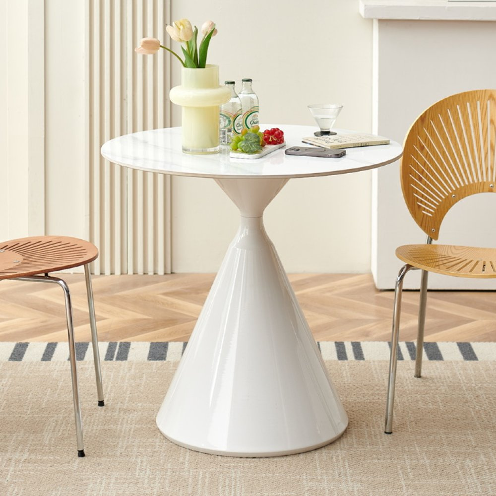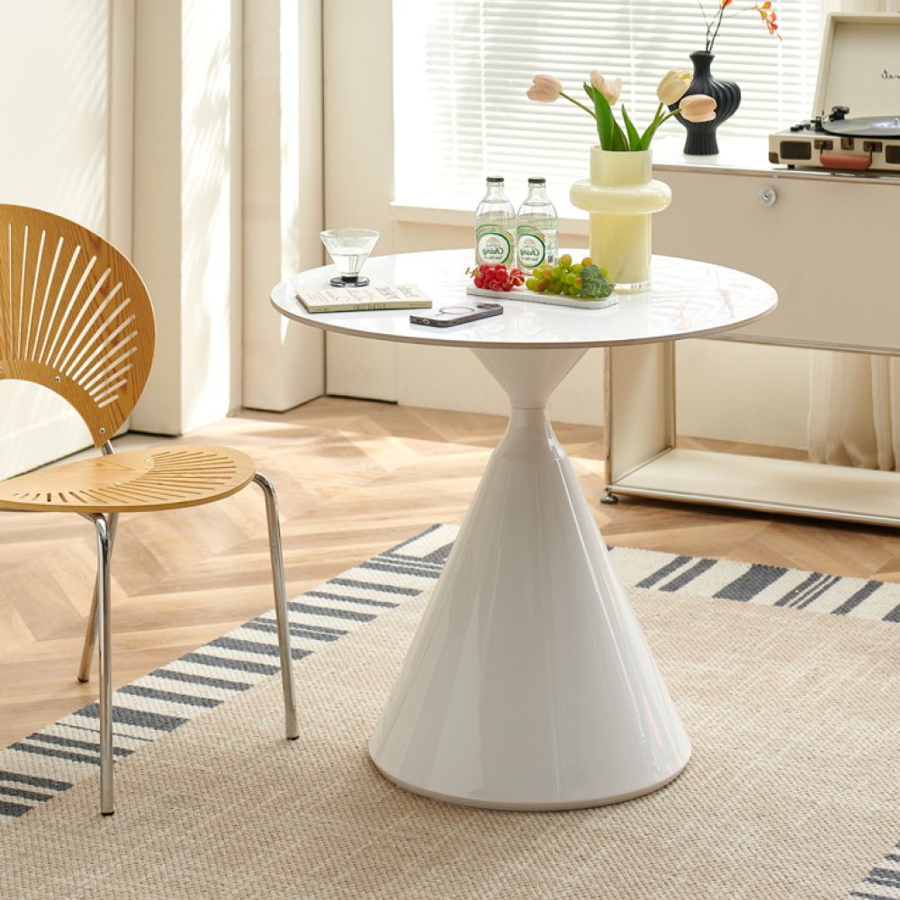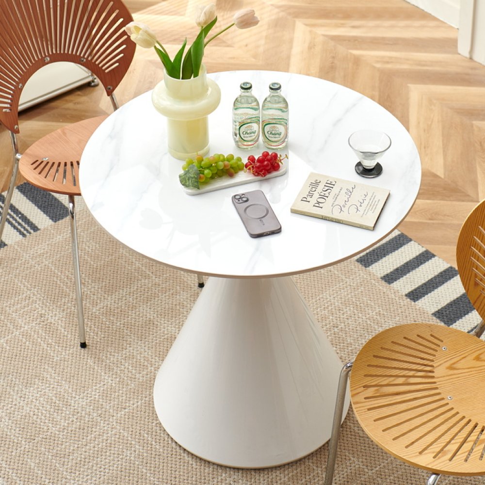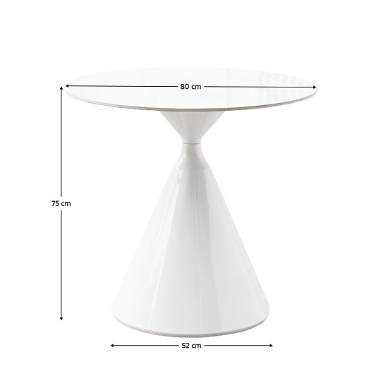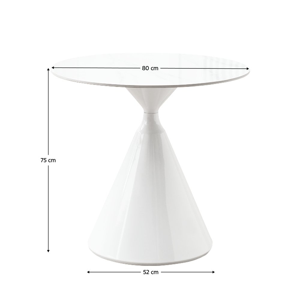 Materiál: kamenný plát/kov Barva: vzor světlý mramor/bílá Rozměry (PxV): 80x75 cm Tloušťka materiálu: 1,1 cm Nosnost: 100 kg Kovová podstava Průměr podstavy: 52 cm Moderní design Kulatý tvar Dodáváno v demontu