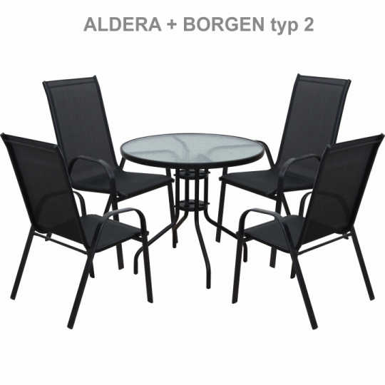 Jídelní stůl vhodný k zahradnímu setu Materiál: tvrzené sklo / ocel Barva: černá Rozměry (ŠxHxV): 80x80x70 cm S otvorem na slunečník Vhodné kombinovat se židlemi Lestra, Doren, Varda, Bergola.