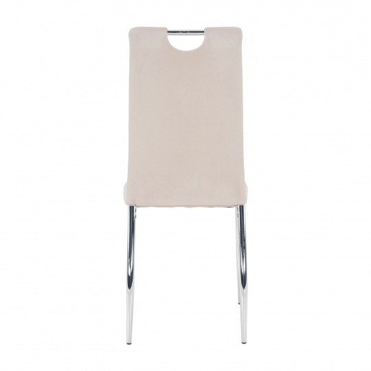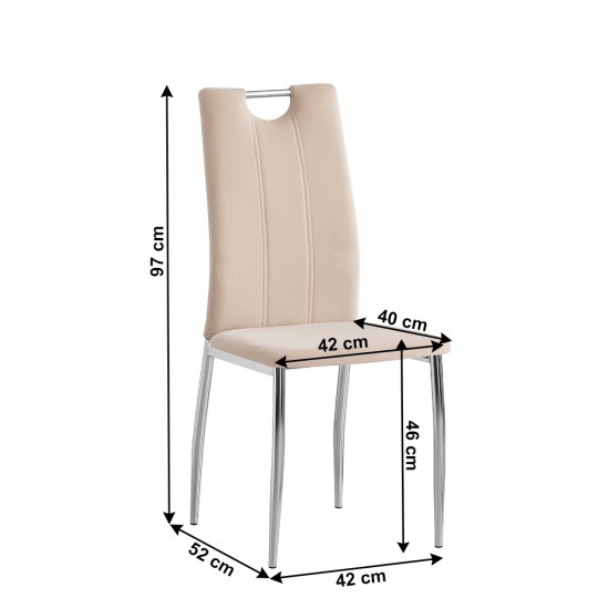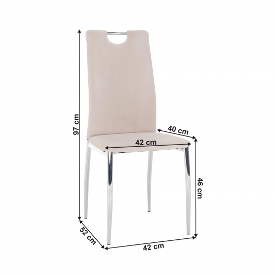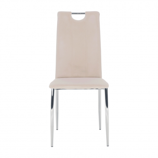 Jídelní židle OLIVA NEW Material: Velvet látka / chrom Barva: béžová Dulux / chrom Oděruodolnost textilie podle testu Martindale: 85 000 oděrek Rozměry (ŠxHxV): 42x52x97 cm Hloubka sedu: 40 cm Výška sedu: 46 cm Šířka sedu: 42 cm Nosnost: 110 kg Dodávané v demontu.