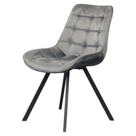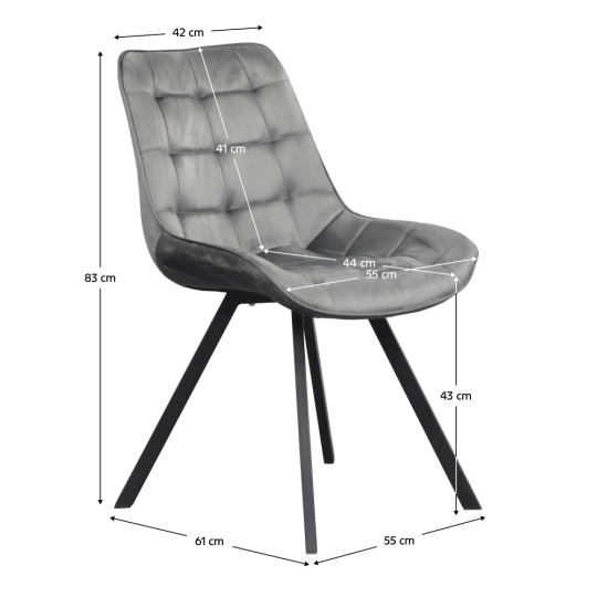Materiál: látka Velvet/kov Oděruodolnost textilie podle testu Martindale: 80 000 oděrů Barva: tmavě šedá/černá Rozměry (ŠxHxV): 55x61x83 cm Výška sedu: 43 cm Hloubka sedu: 44 cm Šířka sedu: 55 cm Výška zad: 41 cm Šířka zad: 42 cm Nosnost: 100 kg Dekorativně prošitá Dodáváno v demontu