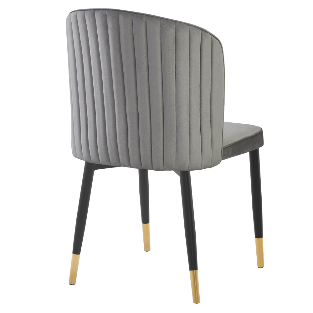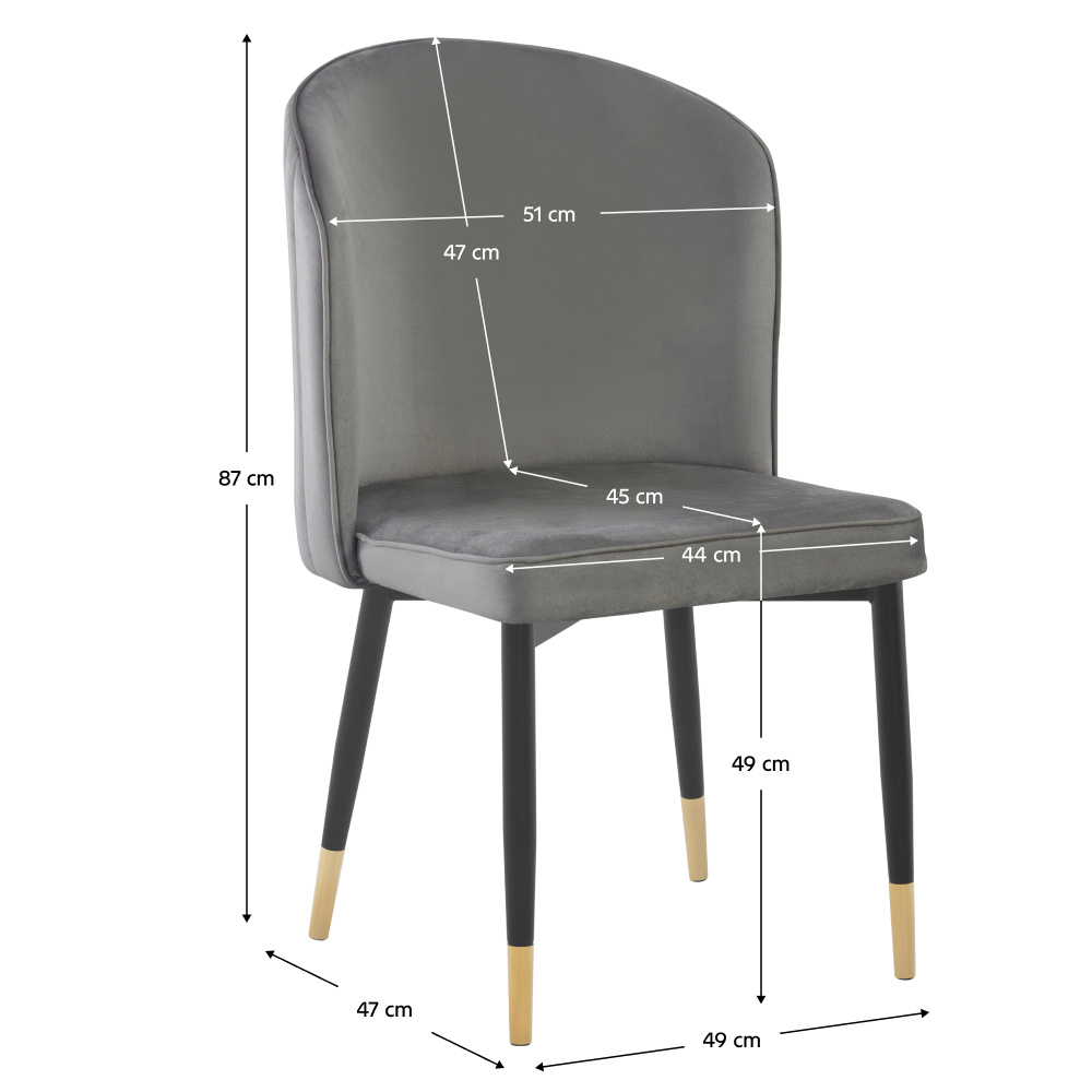 Materiál: Velvet látka/kov Oděruodolnost textilie podle testu Martindale: 85 000 oděrů Barva: šedá/černá/zlatá Rozměry (ŠxHxV): 49x47x87 cm Výška sedu: 49 cm Hloubka sedu: 45 cm Šířka sedu: 44 cm Výška zádové opěrky: 47 cm Šířka zádové opěrky: 51 cm Zaoblené opěradlo Dekorativně prošívaná Jídelní Designová Nosnost: 90 kg Dodáváno v demontu