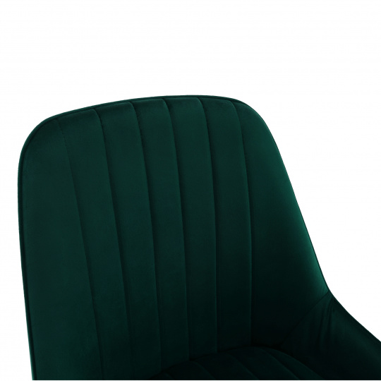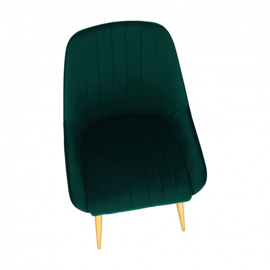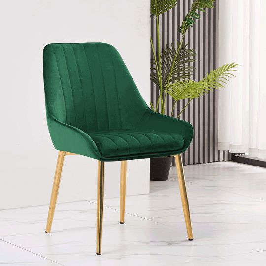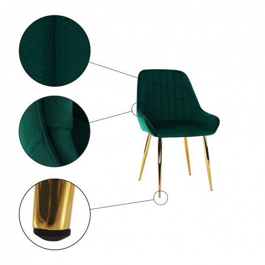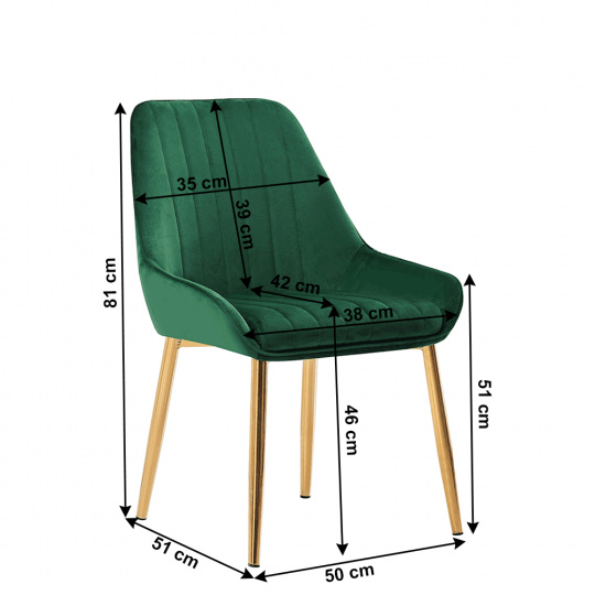 Materiál: látka Velvet / chrom Oděruodolnost textilie podle testu Martindale: 95 000 oděrek Barva: smaragdová / gold chrom-zlatá Rozměry (ŠxHxV): 56x62x89 cm Výška sedu: 50 cm Hloubka sedu: 42 cm Šířka sedu: 43 cm Rozměry zádové opěrky (ŠxV): 46x45 cm moderní Nosnost: 90 kg atraktivní vzhled Obsahuje plastové krytky chránící podlahu Dodávané v demontu