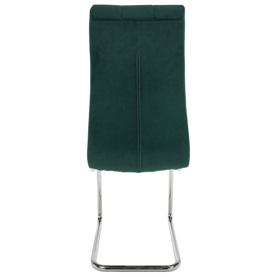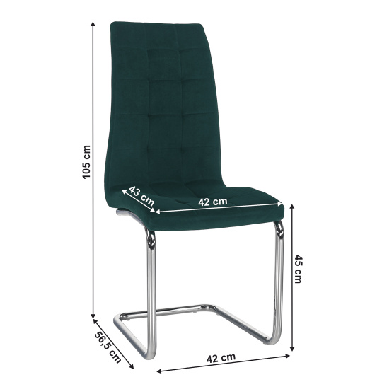 Jídelní židle Materiál: velvet látka v barevném provedení smaragdová/ chrom Rozměry (ŠxHxV): 42x56,5x105 cm Oděruodolnost textilie podle testu Martindale: 85 000 oděrek Hloubka sezení: 43 cm Výška sezení: 45 cm Šířka sezení: 42 cm Nosnost: 110 kg