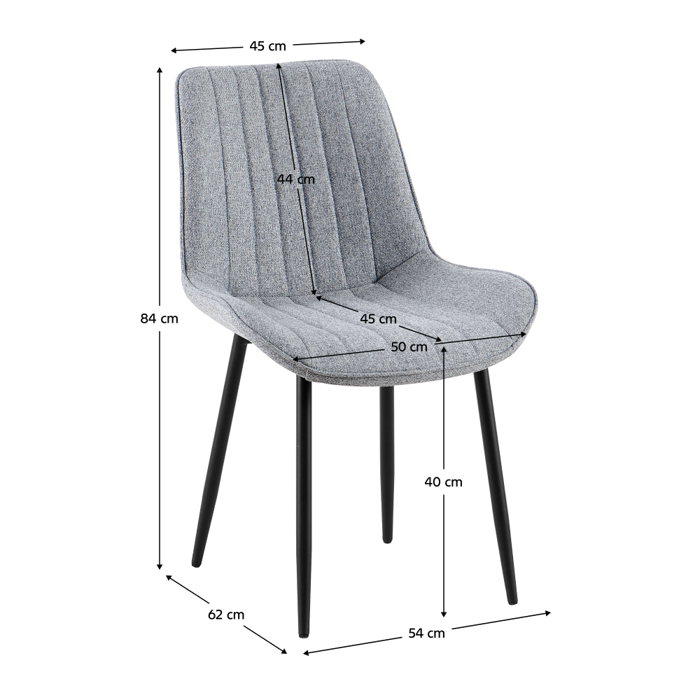 Materiál: látka Lumos 08/kov Oděruodolnost textilie podle testu Martindale: 80 000 oděrů Barva: světle šedá/černá Rozměry (ŠxHxV): 54x62x84 cm Výška sedu: 40 cm Hloubka sedu: 45 cm Šířka sedu: 50 cm Šířka zádové opěrky: 45 cm Výška zádové opěrky: 44 cm Nosnost: 100 kg Hmotnost: 4,5 kg Jídelní Dekorativní prošití Moderní design Dodáváno v demontu