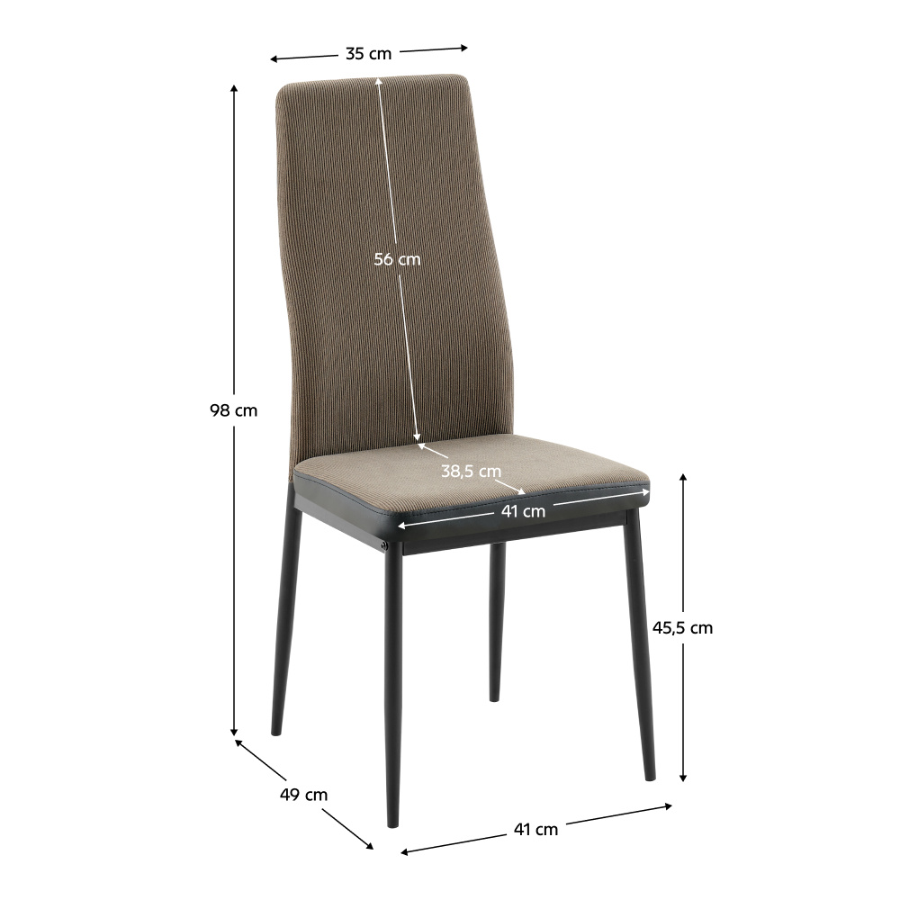 Materiál čalounění: látka/ekokůže Oděruodolnost textilie podle testu Martindale: 50 000/100 000 oděrů Barva: tmavě hnědá/černá Materiál nohy: kov Barva: černá Rozměry (ŠxHxV): 41x49x98 cm Výška sedu: 45,5 cm Hloubka sedu: 38,5 cm Šířka sedu: 41 cm Šířka zádové opěrky: 35 cm Výška zádové opěrky: 56 cm Nosnost: 100 kg Dodáváno v demontu