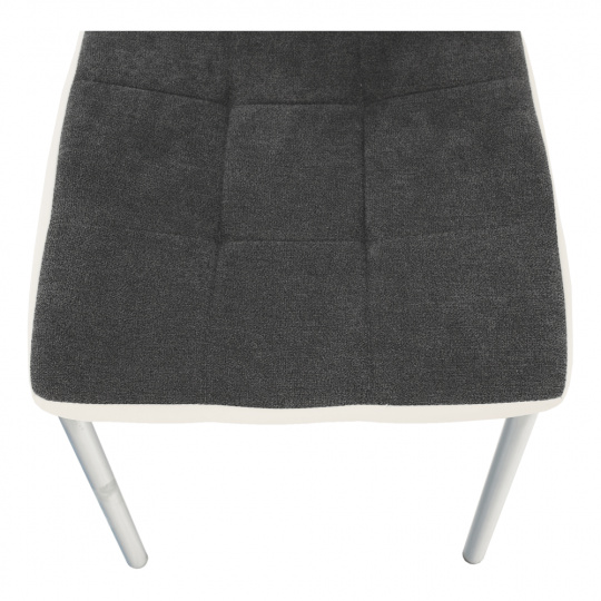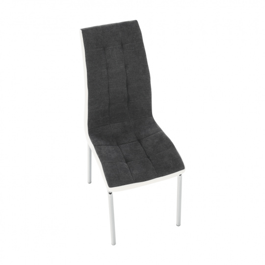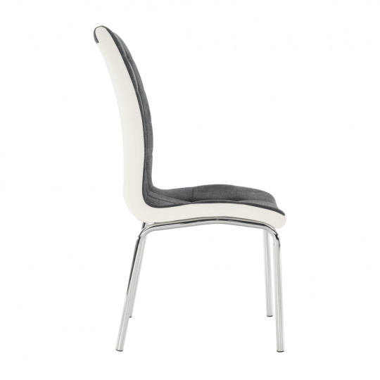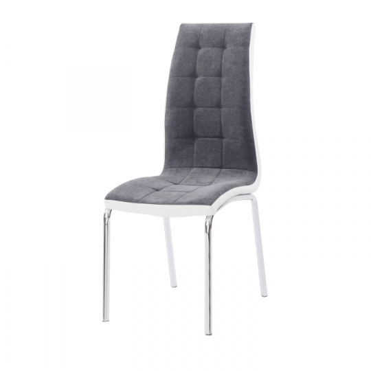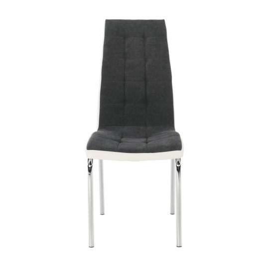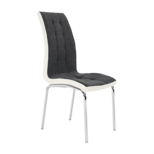 Jídelní židle GERDA NEW Materiál: látka / ekokůže / chrom Oděruodolnost textilie podle testu Martindale: 50 000/100 000 oděrek Barevné provedení: tmavě šedá / bílá Rozměry (ŠxHxV): 42x58x103 cm Výška sedu: 45 cm Nosnost: 110 kg Dodávané v demontu.