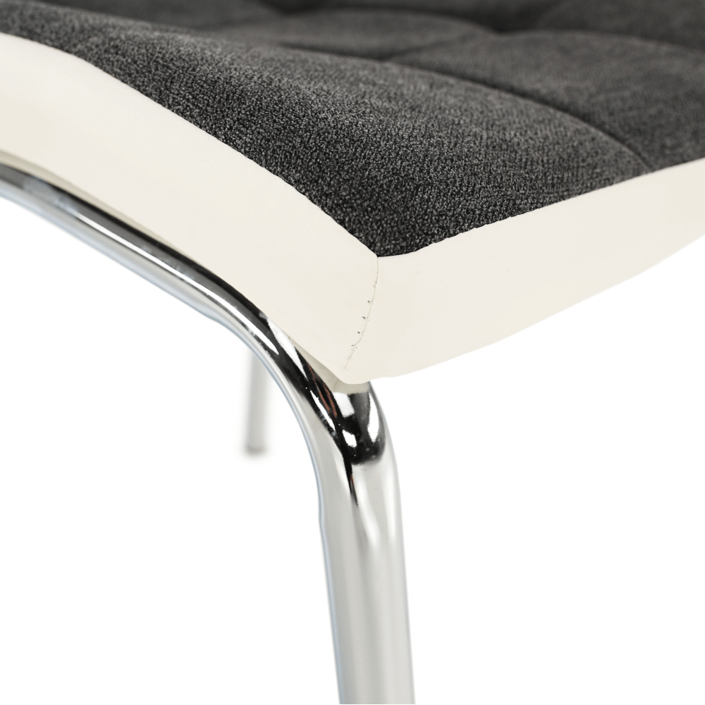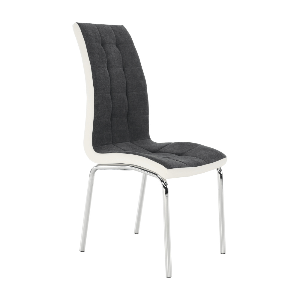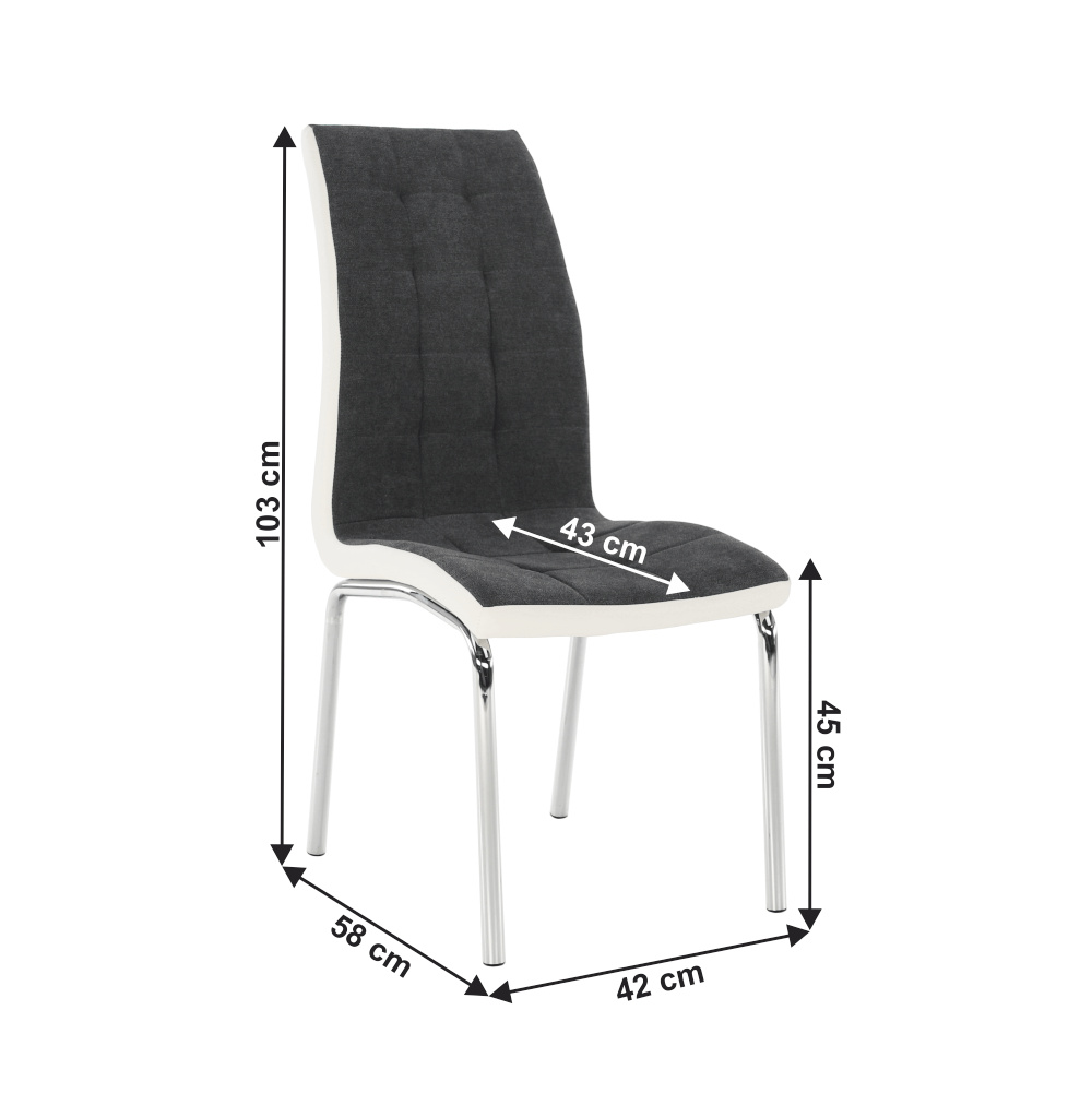 Jídelní židle GERDA NEW Materiál: látka / ekokůže / chrom Oděruodolnost textilie podle testu Martindale: 50 000/100 000 oděrek Barevné provedení: tmavě šedá / bílá Rozměry (ŠxHxV): 42x58x103 cm Výška sedu: 45 cm Nosnost: 110 kg Dodávané v demontu.