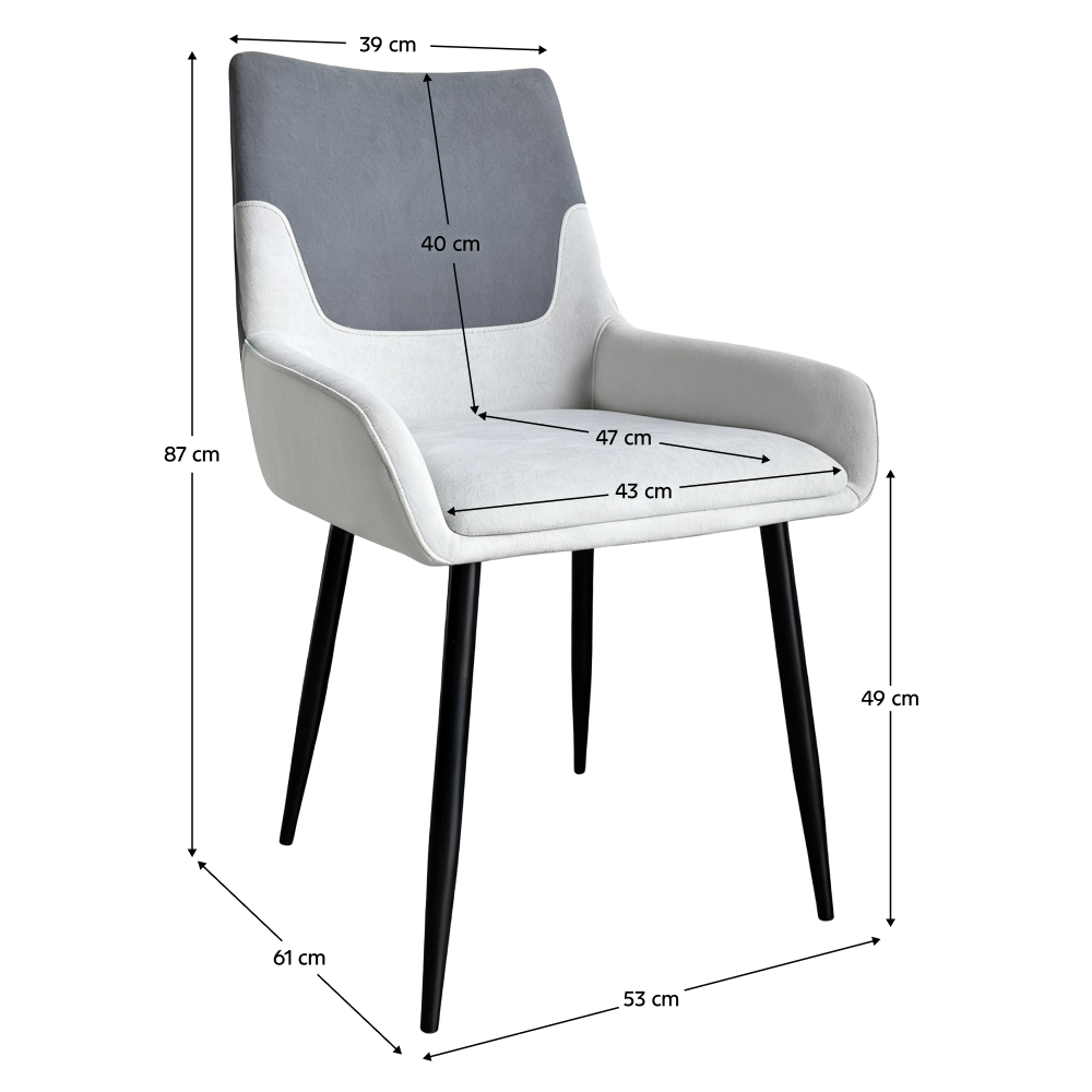 Materiál: látka/kov Oděruodolnost textilie podle testu Martindale: 80 000 oděrů Barva: tmavě šedá/světle šedá/černá Rozměry (ŠxHxV): 53x61x87 cm Výška sedu: 49 cm Hloubka sedu: 47 cm Šířka sedu: 43 cm Výška zádové opěrky: 40 cm Šířka zádové opěrky: 39 cm Nosnost: 100 kg Jídelní Kovová konstrukce Moderní design Dodáváno v demont