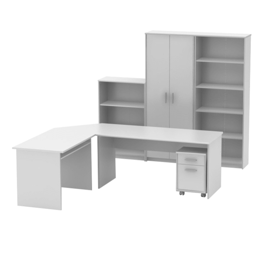 Kancelářská sestava JOHAN 2 NEW Materiál: DTD laminovaná Barva: bílá Rozměry psacího stolu (ŠxHxV): 150x67,5x73,5 cm Rozměry psacího stolku s vysouvací částí (ŠxHxV): 100x67,5x73,5 cm Rozměry rohového stolku (ŠxHxV): 67,5x67,5x73,5 cm Rozměry kontejneru (ŠxHxV): 39x40,5x55 cm Rozměry z nízkého regálu (ŠxHxV): 72,5x33,8x115,5 cm Rozměry z vysokého regálu (ŠxHxV): 72,5x33,8x186 cm Rozměry skříně (ŠxHxV): 72,5x33,8x186 cm Tloušťka materiálu: 16/22 mm ABS hrany Slovenský výrobek Dodávané v demontu