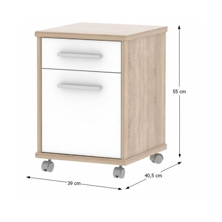 ancelářský kontejner JOHAN 2 NEW 07 s jedním šuplíkem a skříňkou barevné provedení: dub sonoma / bílá, materiál: DTD lamiovaná / ABS hrany Rozměry (ŠxHxV): 39x40,5x55 cm Rozměry šuplíku (ŠxHxV): 34,8x35x12,5 cm Rozměry skříňky (ŠxHxV): 35,2x38x34,8 cm Tloušťka materiálu: 16/22 mm čtyři kolečka slovenský výrobek Dodávané v demontu Hmotnost