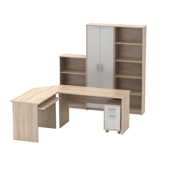 Kancelářská sestava JOHAN 2 NEW Materiál: DTD laminovaná Barva: dub sonoma / bílá Rozměry psacího stolu (ŠxHxV): 150x67,5x73,5 cm Rozměry psacího stolku s vysouvací částí (ŠxHxV): 100x67,5x73,5 cm Rozměry rohového stolku (ŠxHxV): 67,5x67,5x73,5 cm Rozměry kontejneru (ŠxHxV): 39x40,5x55 cm Rozměry z nízkého regálu (ŠxHxV): 72,5x33,8x115,5 cm Rozměry z vysokého regálu (ŠxHxV): 72,5x33,8x186 cm Rozměry skříně (ŠxHxV): 72,5x33,8x186 cm Tloušťka materiálu: 16/22 mm ABS hrany slovenský výrobek Dodávané v demontu
