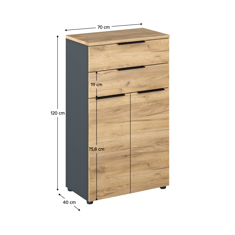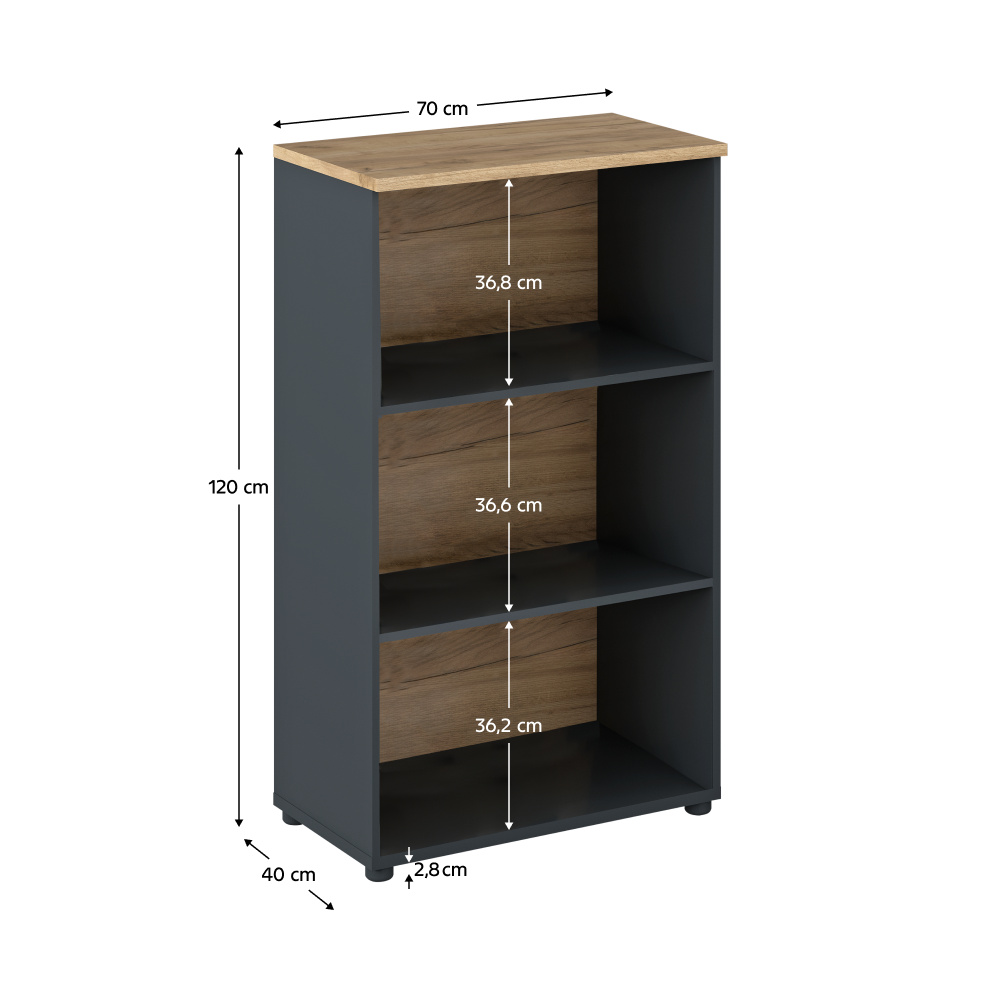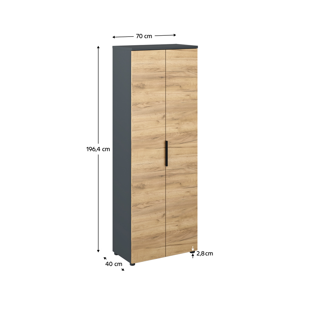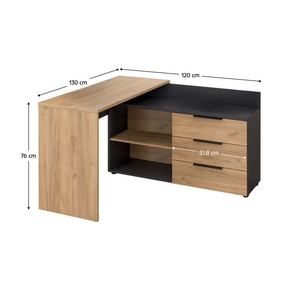 Kancelářská sestava KLAUDIUS Materiál: DTD laminovaná Barva: garfit/dub artisan Rohový PC stůl (ŠxHxV): 130x120x76 cm Regál (ŠxHxV): 70x40x120 cm Vysoký regál (ŠxHxV): 70x40x196,40 cm Skříňka (ŠxHxV): 70x40x120 cm Vysoká skříň (ŠxHxV): 70x40x196,40 cm Tloušťka materiálu: 1,6-2,2 cm S úchytkou Barva úchytky: aluminiová Na nožičkách Výškově nastavitelné nožičky Materiál nožiček: kov Barva nožiček: grafit Výška nožiček: 2,8-4,3 cm Nosnost police: 5 kg Nosnost šuplíku: 5 kg Nosnost vrchního platu stolu: 35 kg Kvalitní slovenský výrobek Dodáváno v demontu