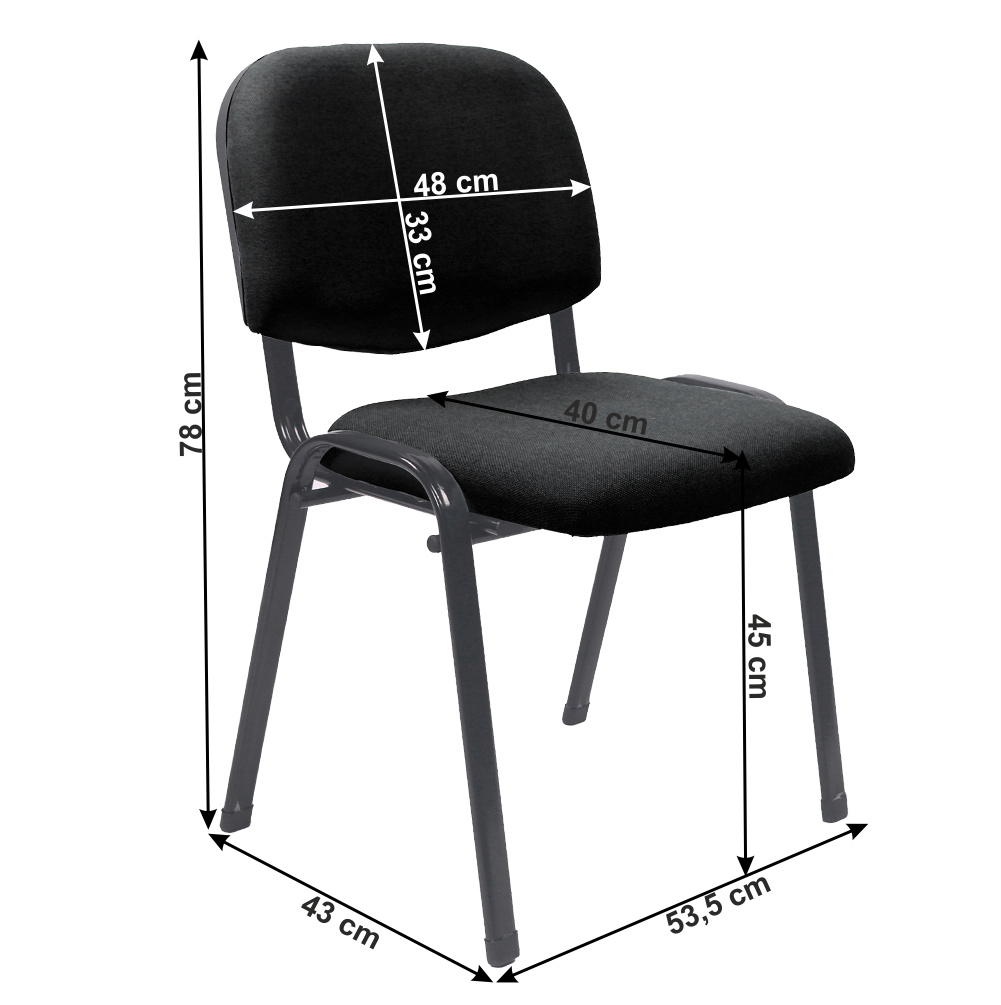 Kancelářská židle ISO ECO Materiál čalounění: látka Oděruodolnost textilie podle testu Martindale: 80 000 oděrů Barva: černá Materiál konstrukce: kov Barva: černá Rozměry (ŠxHxV): 53,5x43x78 cm Výška sedu : 45 cm Hloubka sedu : 40 cm Výška opěradla: 33 cm Šířka opěradla: 48 cm Nosnost: 90 kg Tloušťka materiálu: 1 mm Stohovací Dodávána v demontu Plánujete používání židle ISO ECO v prostředí s dennodenní vyšší zátěží používání, prosím zvažte možnost koupě pevnějšího modelu určeného pro vyšší zátěž a to ISO NEW.
