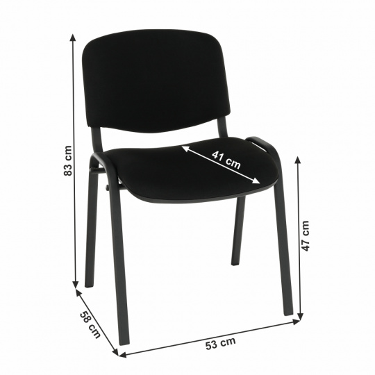Kancelářská židle ISO NEW Materiál: látka/kov Oděruodolnost textilie podle testu Martindale: 80 000 oděrů Barva: černá Rozměry (ŠxHxV): 53x58x83 cm Výška sedu : 47 cm Hloubka sedu : 41 cm Nosnost: 110 kg Tloušťka materiálu: 1,2 mm Stohovací Dodávána v montě