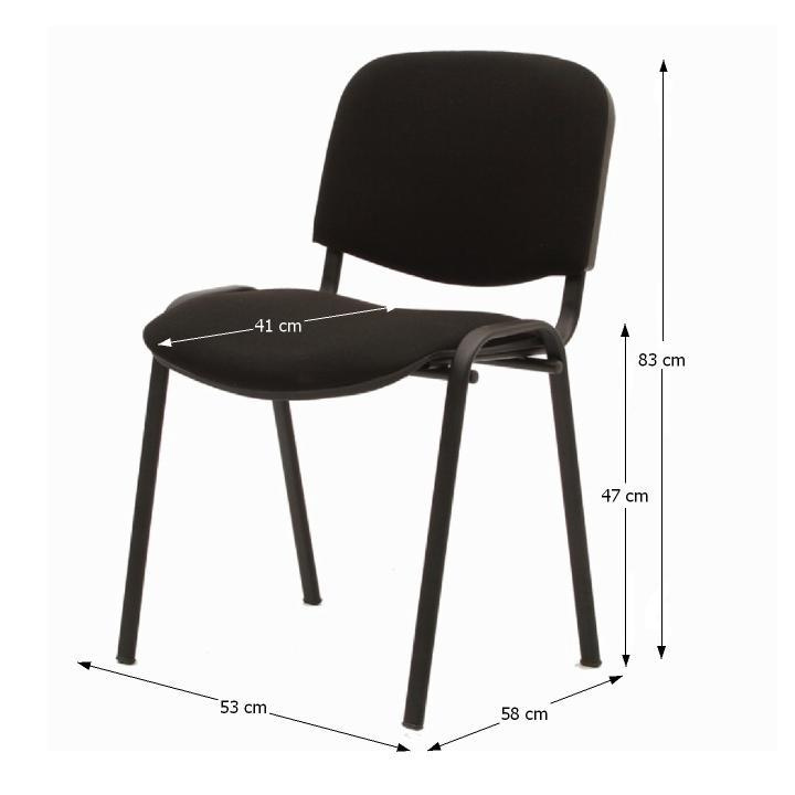 Kancelářská židle ISO NEW Materiál: látka/kov Oděruodolnost textilie podle testu Martindale: 80 000 oděrů Barva: černá Rozměry (ŠxHxV): 53x58x83 cm Výška sedu : 47 cm Hloubka sedu : 41 cm Nosnost: 110 kg Tloušťka materiálu: 1,2 mm Stohovací Dodávána v montě