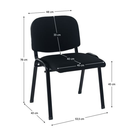 Kancelářská židle ISO ECO Materiál čalounění: látka Oděruodolnost textilie podle testu Martindale: 80 000 oděrů Barva: černá Materiál konstrukce: kov Barva: černá Rozměry (ŠxHxV): 53,5x43x78 cm Výška sedu : 45 cm Hloubka sedu : 40 cm Výška opěradla: 33 cm Šířka opěradla: 48 cm Nosnost: 90 kg Tloušťka materiálu: 1 mm Stohovací Dodávána v demontu Plánujete používání židle ISO ECO v prostředí s dennodenní vyšší zátěží používání, prosím zvažte možnost koupě pevnějšího modelu určeného pro vyšší zátěž a to ISO NEW.