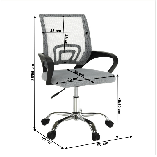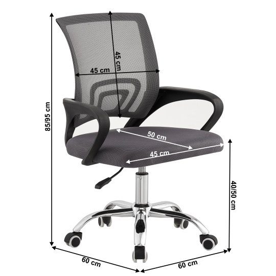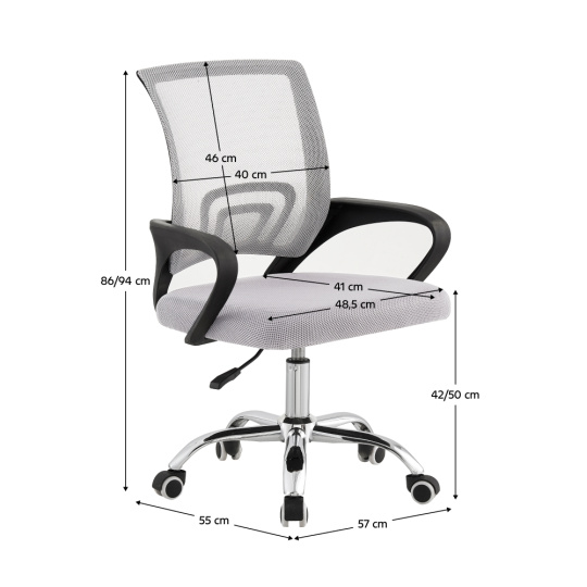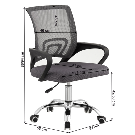 Kancelářské křeslo DEX 4 NEW Materiál: síťovina/plast/kov Oděruodolnost textilie podle testu Martindale: 90 000 oděrů Barva: šedá/chrom Rozměry (ŠxHxV): 57x55x86-94 cm Nastavitelná výška sedu: 42-50 cm Hloubka sedu: 41 cm Šířka sedu: 48,5 cm Šířka zádové opěrky: 40 cm Výška zádové opěrky: 46 cm Nosnost: 100 kg Otáčivé Univerzální kolečka vhodná pro měkké i tvrdé podlahy Dodáváno v demontu