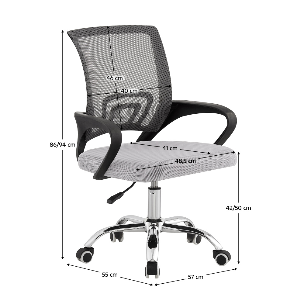 Kancelářské křeslo DEX 4 NEW Materiál: síťovina/plast/kov Oděruodolnost textilie podle testu Martindale: 90 000 oděrů Barva: šedá/chrom Rozměry (ŠxHxV): 57x55x86-94 cm Nastavitelná výška sedu: 42-50 cm Hloubka sedu: 41 cm Šířka sedu: 48,5 cm Šířka zádové opěrky: 40 cm Výška zádové opěrky: 46 cm Nosnost: 100 kg Otáčivé Univerzální kolečka vhodná pro měkké i tvrdé podlahy Dodáváno v demontu