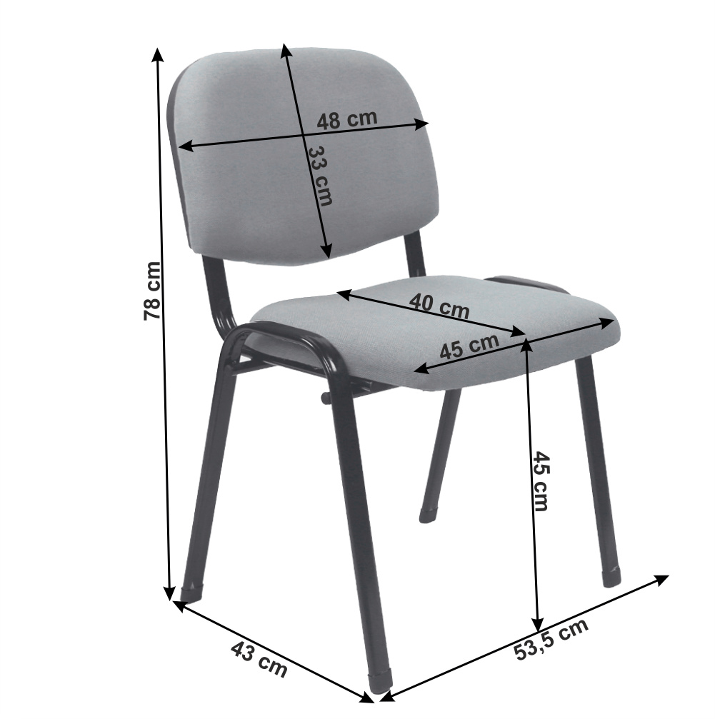 Kancelářská židle ISO ECO Materiál čalounění: látka Oděruodolnost textilie podle testu Martindale: 80 000 oděrů Barva: šedá Materiál konstrukce: kov Barva: černá Rozměry (ŠxHxV): 53,5x43x78 cm Výška sedu : 45 cm Hloubka sedu : 40 cm Výška opěradla: 33 cm Šířka opěradla: 48 cm Nosnost: 90 kg Tloušťka materiálu: 1 mm Stohovací Dodávána v demontu Plánujete používání židle ISO ECO v prostředí s dennodenní vyšší zátěží používání, prosím zvažte možnost koupě pevnějšího modelu určeného pro vyšší zátěž a to ISO NEW.