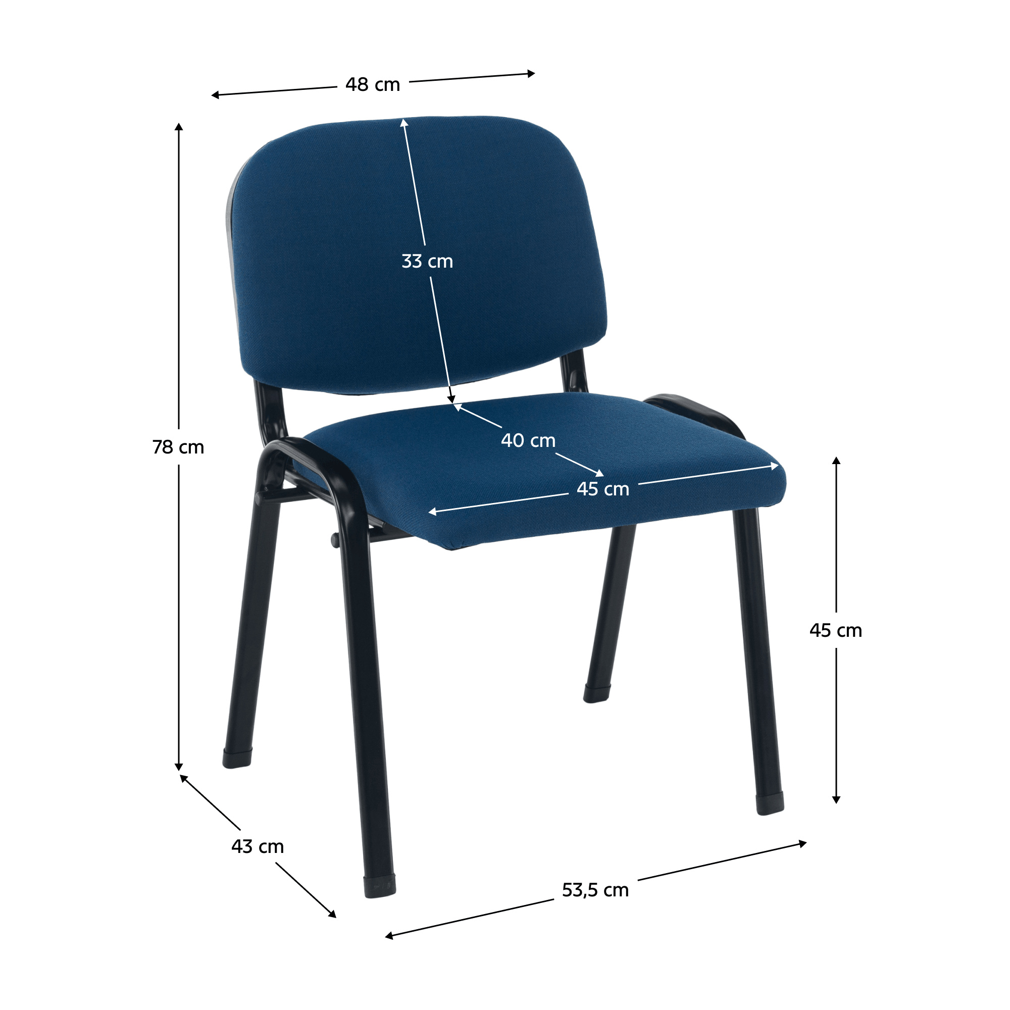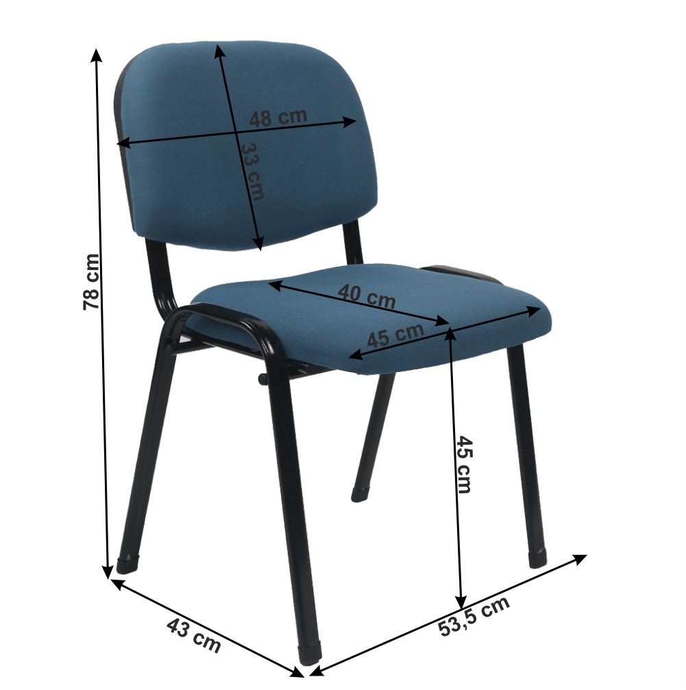 Materiál čalounění: látka Oděruodolnost textilie podle testu Martindale: 80 000 oděrů Barva: tmavě modrá Materiál konstrukce: kov Barva: černá Rozměry (ŠxHxV): 53,5x43x78 cm Výška sedu : 45 cm Hloubka sedu : 40 cm Výška opěradla: 33 cm Šířka opěradla: 48 cm Nosnost: 90 kg Tloušťka materiálu: 1 mm Stohovací Dodávána v demontu