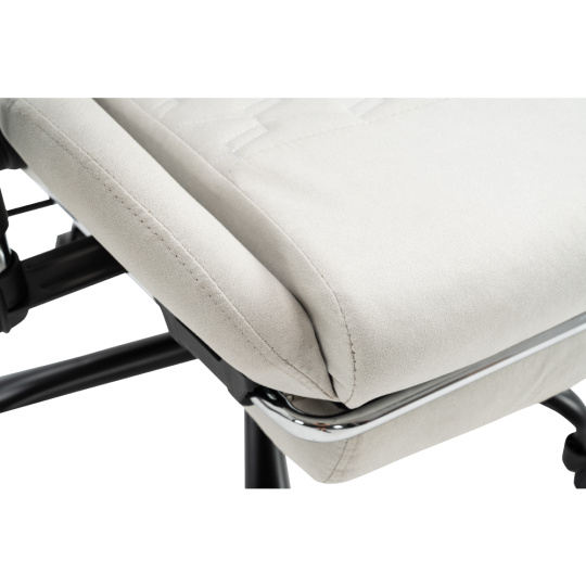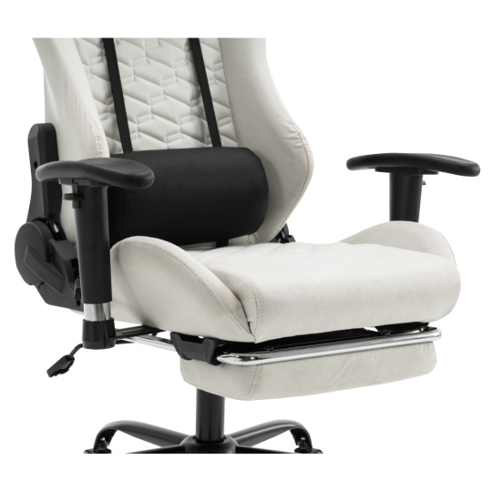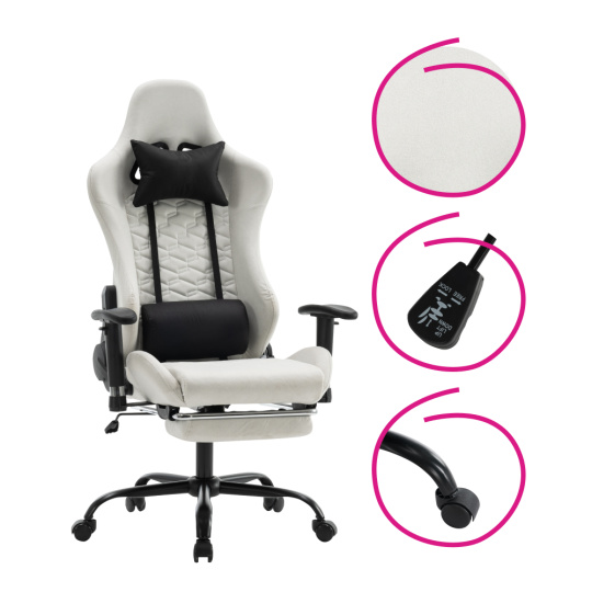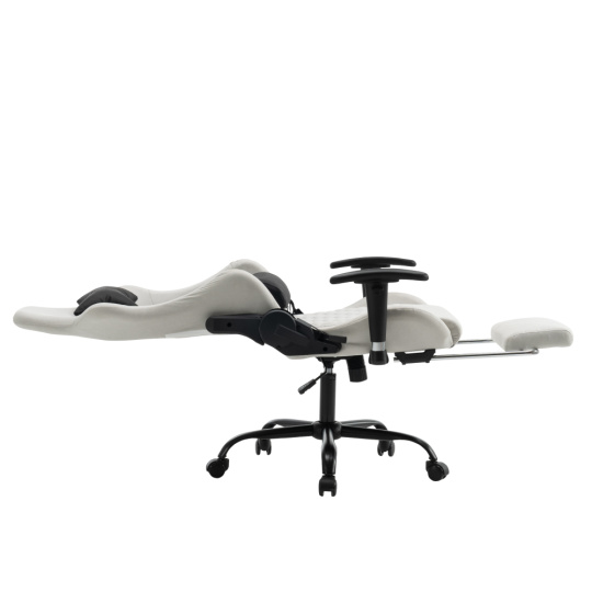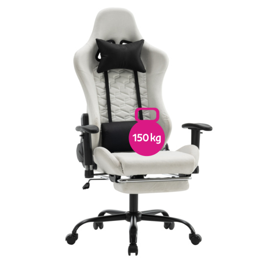 Materiál: železo/plast Oděruodolnost textilie podle testu Martindale: 15 000 oděrů Barva: bílá/černá Rozměry (ŠxHxV): 66x67x129-139 cm Výška sedu: 48-58 cm Šířka sedu: 38 cm Hloubka sedu: 42 cm Výška zádové opěrky: 82 cm Šířka zádové opěrky: 57 cm Nosnost: 150 kg Hmotnost: 19 kg Nastavitelná výška sedu Nastavitelná opěrka hlavy Polohovací opěrka zad má sklon 90-180° Odnímatelná opěrka hlavy a bederní opěrka Výsuvná podnož Otočné Mechanismus houpání Univerzální kolečka Vhodné pro tvrdé i měkké podlahy Pětiramenná podstava Dodáváno v demontu