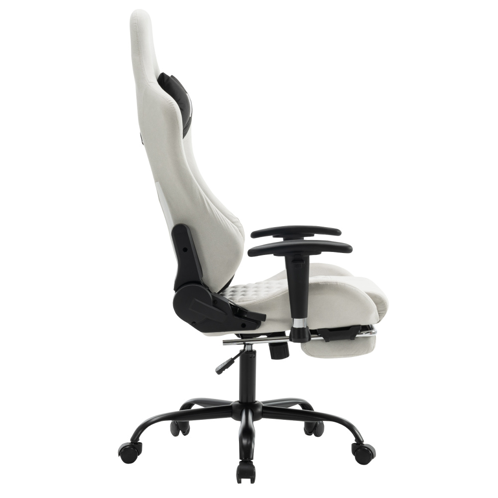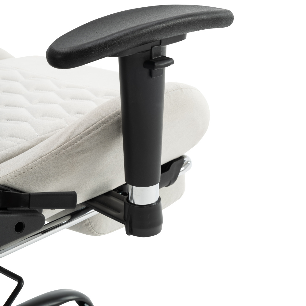Materiál: železo/plast Oděruodolnost textilie podle testu Martindale: 15 000 oděrů Barva: bílá/černá Rozměry (ŠxHxV): 66x67x129-139 cm Výška sedu: 48-58 cm Šířka sedu: 38 cm Hloubka sedu: 42 cm Výška zádové opěrky: 82 cm Šířka zádové opěrky: 57 cm Nosnost: 150 kg Hmotnost: 19 kg Nastavitelná výška sedu Nastavitelná opěrka hlavy Polohovací opěrka zad má sklon 90-180° Odnímatelná opěrka hlavy a bederní opěrka Výsuvná podnož Otočné Mechanismus houpání Univerzální kolečka Vhodné pro tvrdé i měkké podlahy Pětiramenná podstava Dodáváno v demontu