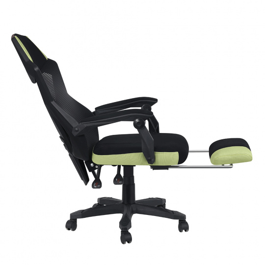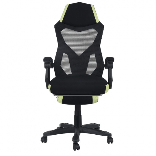 Materiál konstrukce: plast Barva: černá Materiál čalounění: síťovina Oděruodolnost síťoviny podle testu Martindale: 90 000 oděrek Barva: černá / zelená Rozměry (ŠxHxV): 60x65x108-118 cm Nastavitelná výška sedu: 45-55 cm Hloubka sedu: 49 cm Šířka sedu: 50 cm Výška zádové opěrky: 75,7 cm Šířka zádové opěrky: 48 cm Maximální nosnost: 150 kg Polohovací opěrka zad má sklon 90-135 ° Určeno pro dlouhé sezení Čalouněné područky Dřevěný nosný rám na sedadle Plastový nosný rám na opěradle plastová podstava výsuvná podnož Dodávané v demontu