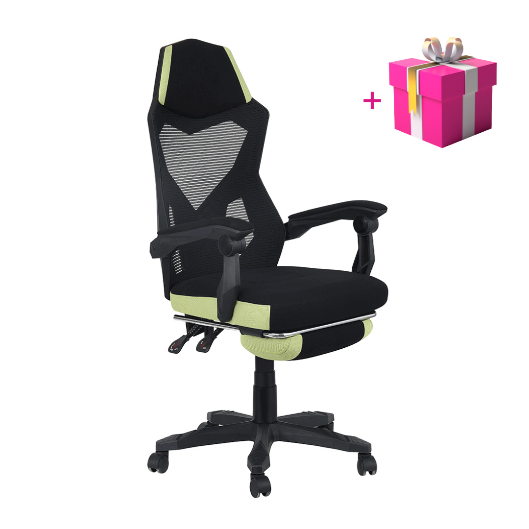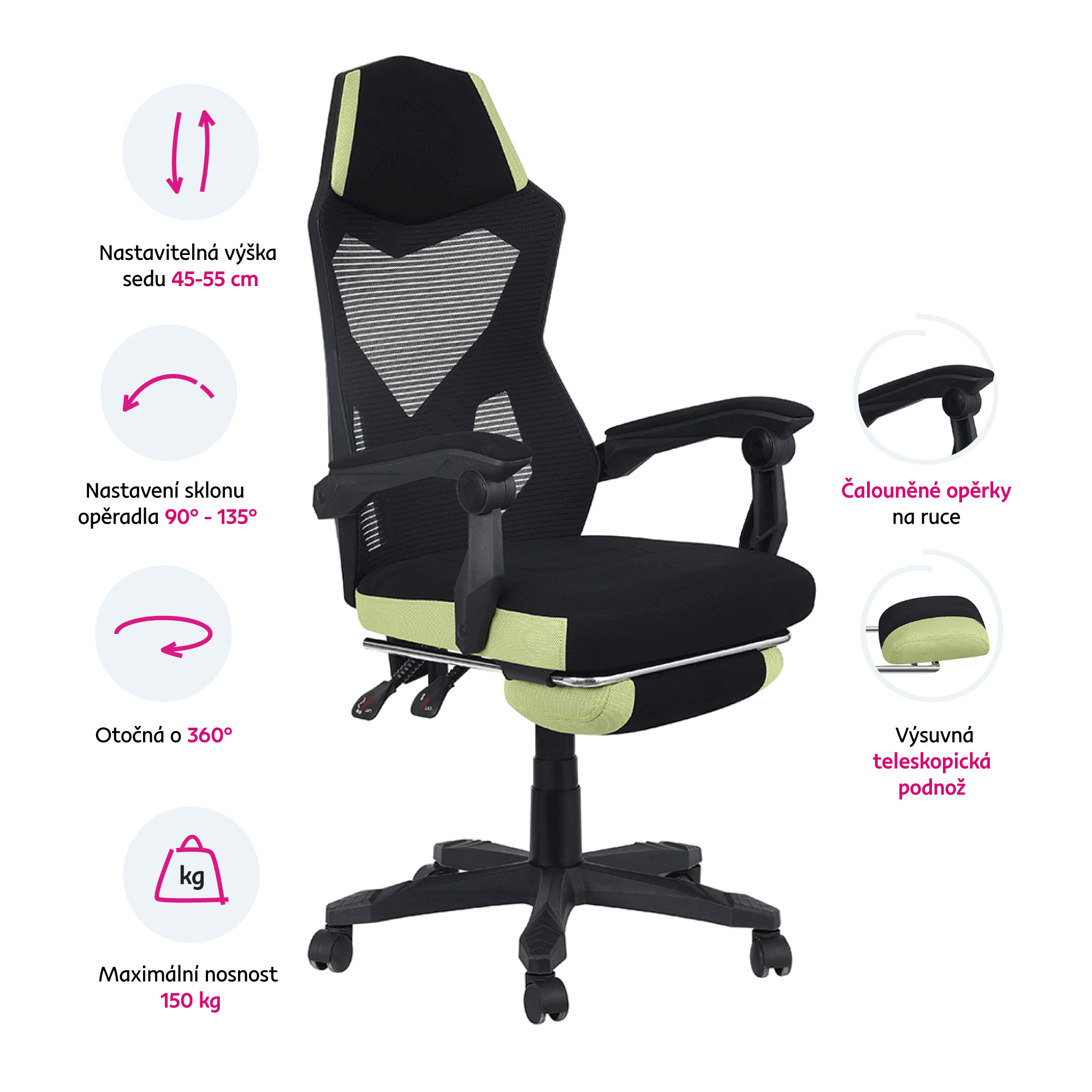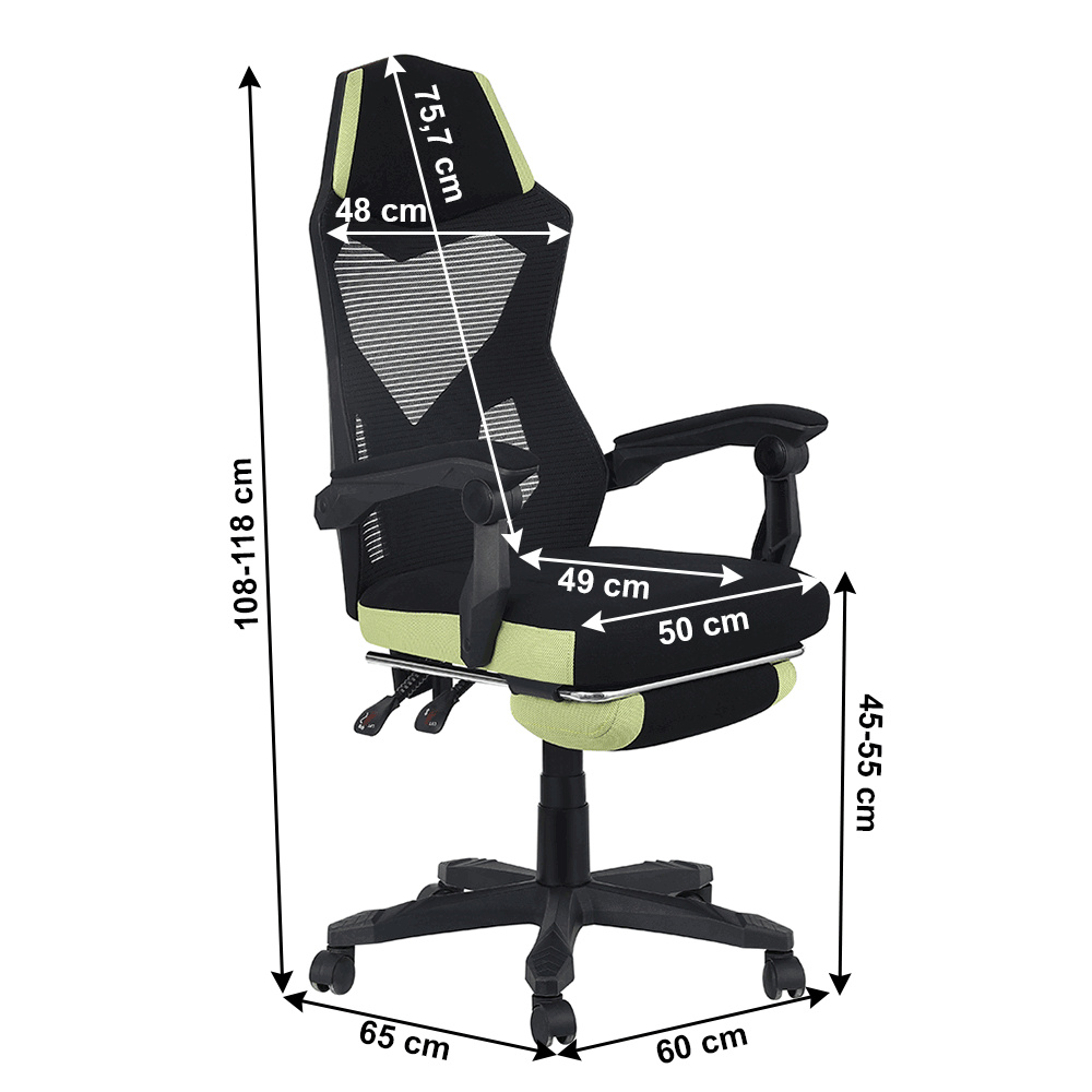 Materiál konstrukce: plast Barva: černá Materiál čalounění: síťovina Oděruodolnost síťoviny podle testu Martindale: 90 000 oděrek Barva: černá / zelená Rozměry (ŠxHxV): 60x65x108-118 cm Nastavitelná výška sedu: 45-55 cm Hloubka sedu: 49 cm Šířka sedu: 50 cm Výška zádové opěrky: 75,7 cm Šířka zádové opěrky: 48 cm Maximální nosnost: 150 kg Polohovací opěrka zad má sklon 90-135 ° Určeno pro dlouhé sezení Čalouněné područky Dřevěný nosný rám na sedadle Plastový nosný rám na opěradle plastová podstava výsuvná podnož Dodávané v demontu