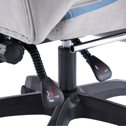Materiál: látka/plast Oděruodolnost textilie podle testu Martindale: 15 000 oděrů Barva: šedá/modrá/černá Rozměry (ŠxHxV): 63x62x113-123 cm Výška sedu: 44-54 cm Šířka sedu: 36 cm Hloubka sedu: 38 cm Výška zádové opěrky: 78 cm Šířka zádové opěrky: 54 cm Nosnost: 130 kg Hmotnost: 14 kg Nastavitelná výška sedu Čalouněné opěrky na ruce Nastavitelná opěrka hlavy Polohovací opěrka zad má sklon 90-135° Odnímatelná opěrka hlavy a bederní opěrka Výsuvná podnož Otočné Mechanismus houpání Univerzální kolečka Vhodné pro tvrdé i měkké podlahy Pětiramenná podstava Dodáváno v demontu