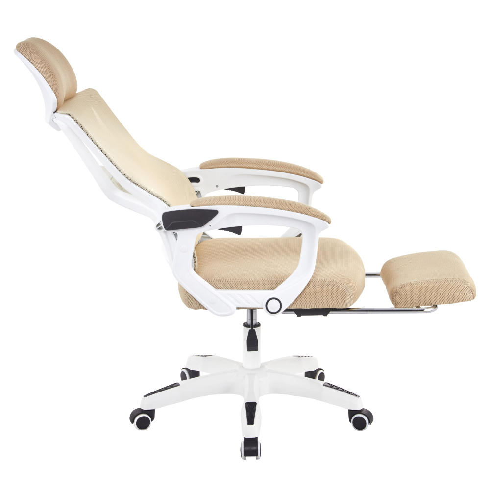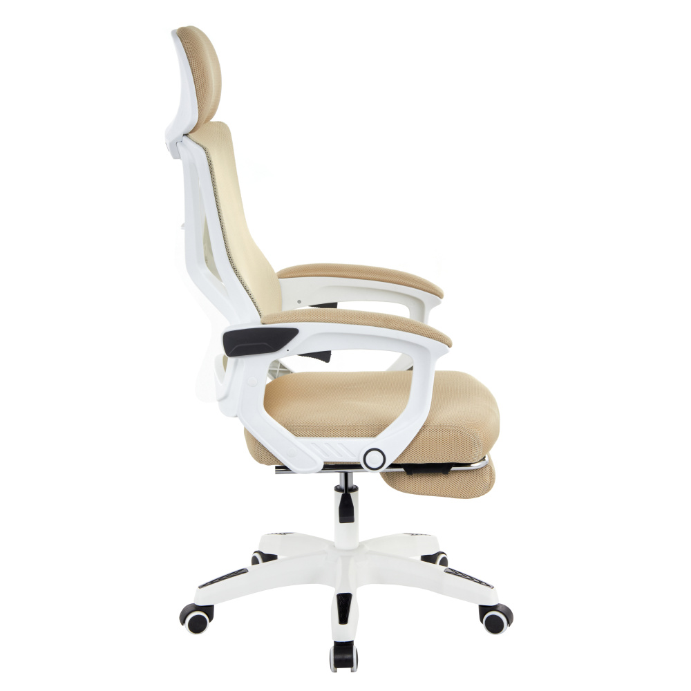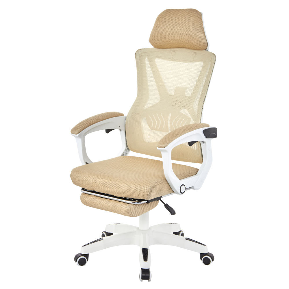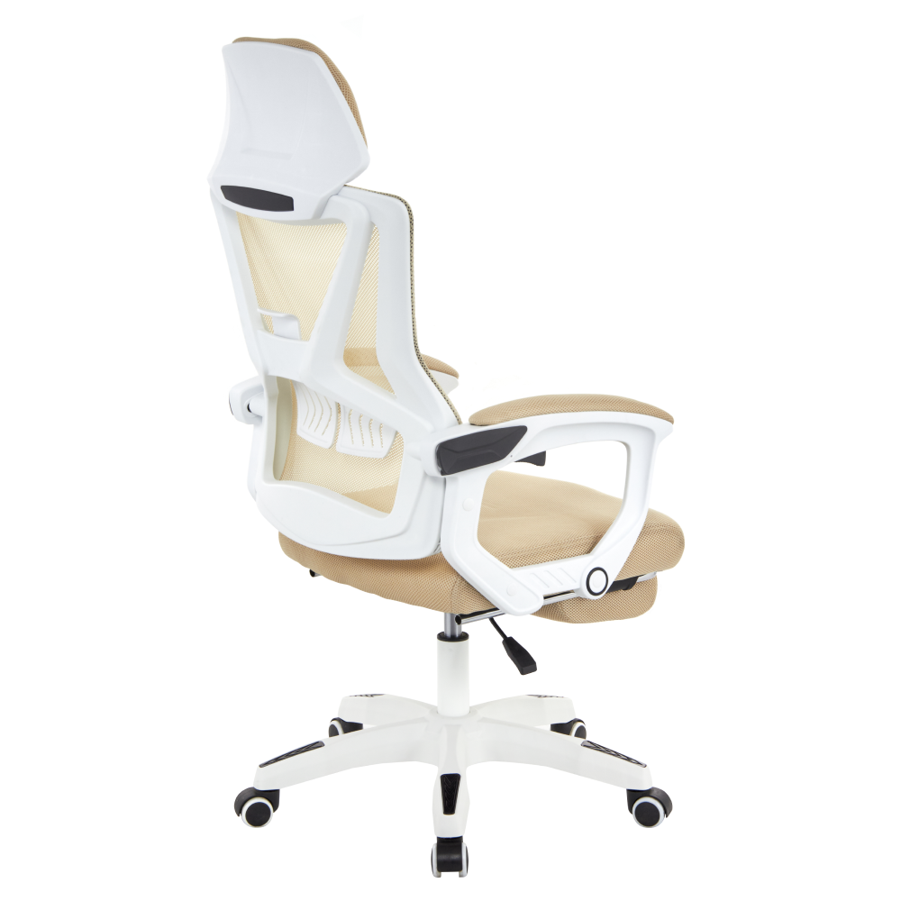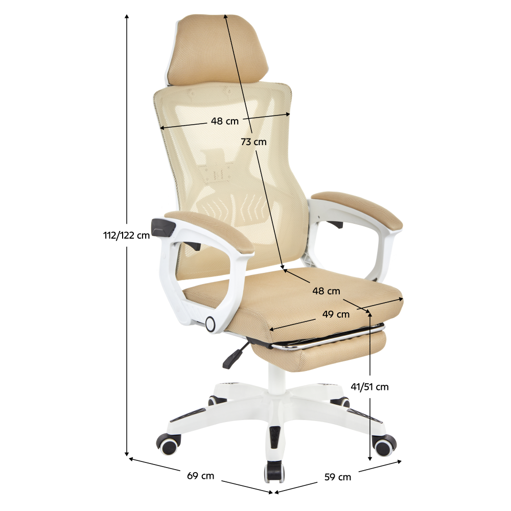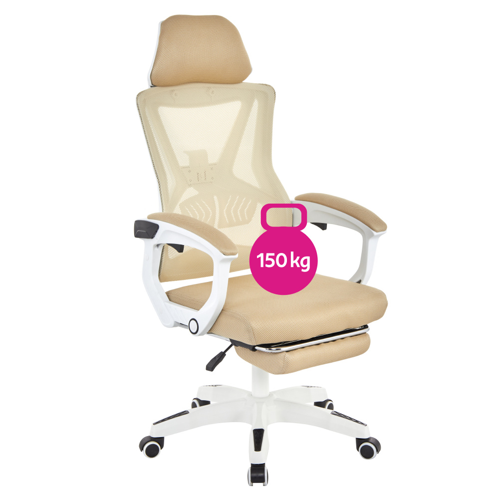 Materiál: síťovina/plast Oděruodolnost textilie podle testu Martindale: 90 000 oděrů Barva: béžová/bílá Rozměry (ŠxHxV): 59x63x112-122 cm Výška sedu: 41-51 cm Šířka sedu: 49 cm Hloubka sedu: 48 cm Výška zádové opěrky: 73 cm Šířka zádové opěrky: 48 cm Nastavitelná výška sedu Čalouněné opěrky na ruku Výsuvná podnožka Polohovací opěrka zad Nastavení tuhosti v oblasti křížů Mechanismus houpání Univerzální kolečka Vhodné pro tvrdé i měkké podlahy Pětiramenná podstava Nosnost: 150 kg Dodáváno v demontu