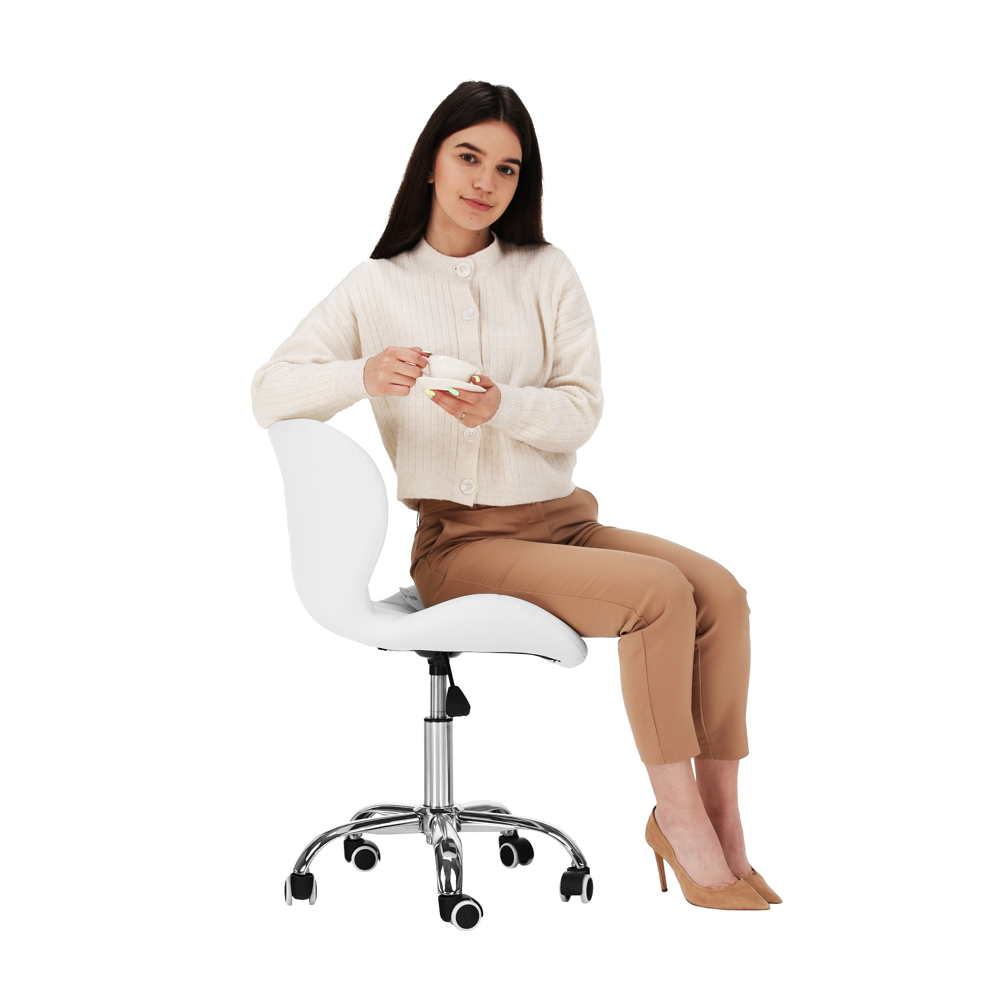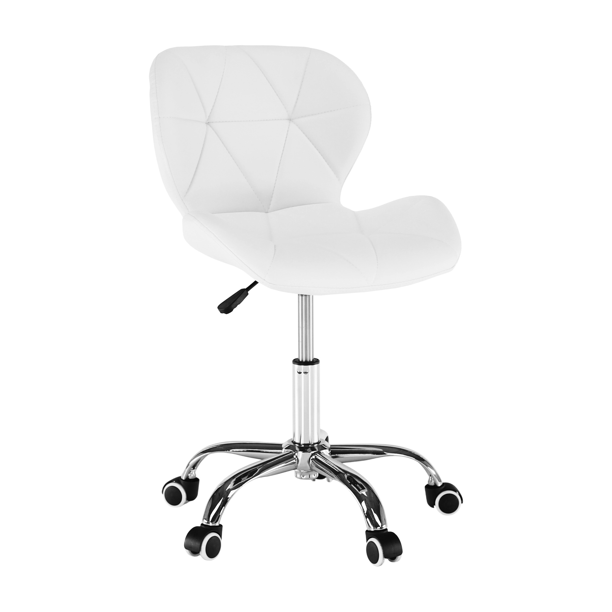 Materiál čalounění: ekokůže Oděruodolnost textilie podle testu Martindale: 100 000 oděrů Barva: bílá Materiál podstava: kov Barva: chrom Rozměry (ŠxHxV): 47x56x73-84 cm Výška sedu: 40-52 cm Hloubka sedu: 37 cm Výška zádové opěrky: 32 cm Šířka zádové opěrky: 42 cm Maximální nosnost: 110 kg Otočné Nastavitelná výška sedu Univerzální kolečka vhodná pro měkké i tvrdé podlahy Dodáváno v demontu