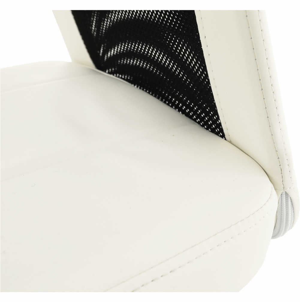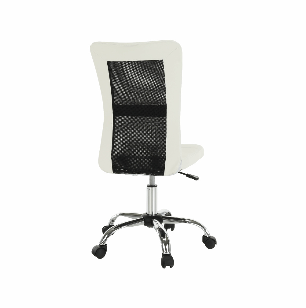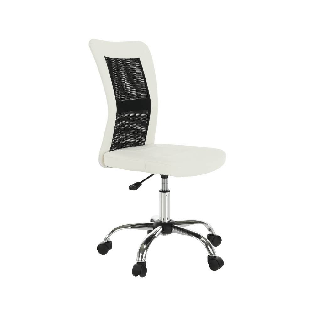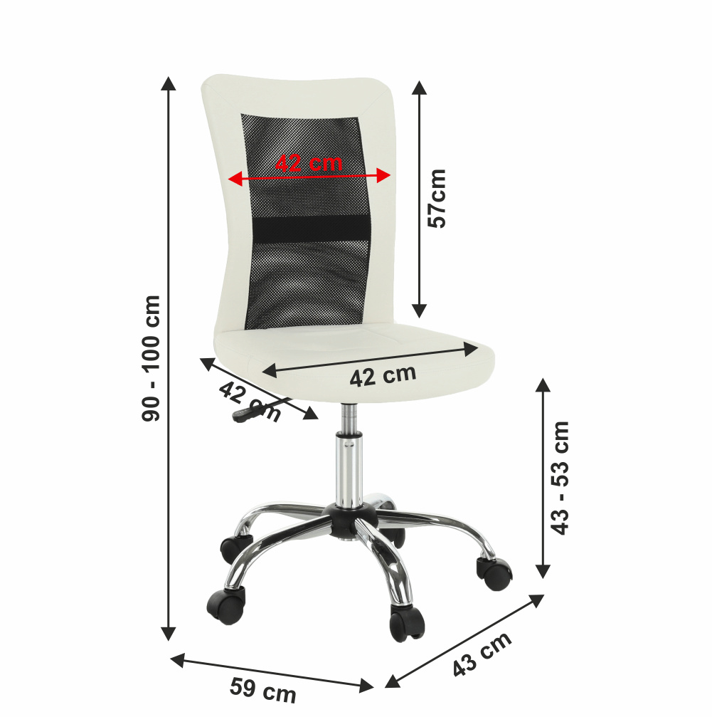 Provedení: černá / bílá Materiál: ekokůže / síťka / chrom Oděruodolnost textilie podle testu Martindale: 100 000 oděrek Oděruodolnost textilie podle testu Martindale: 90 000 oděrek Rozměry (ŠxHxV): 43x59x90-100 cm Výška sedu: 43-53 cm Hloubka sedu: 42 cm Šířka sedu: 42 cm Výška zádové opěrky: 57 cm Šířka zádové opěrky: 39 cm Nosnost: 110 kg Dodávané v demontu.