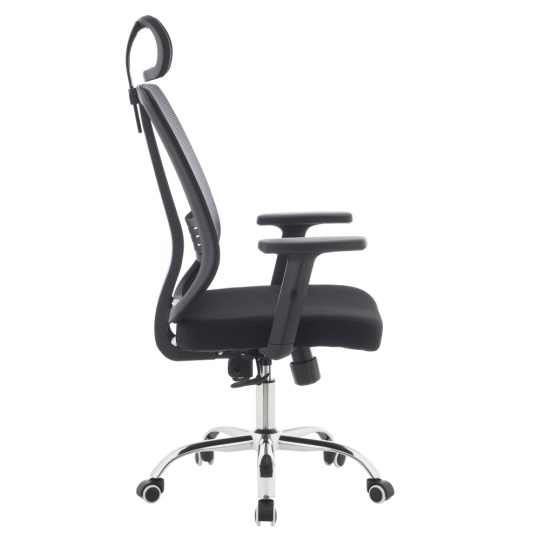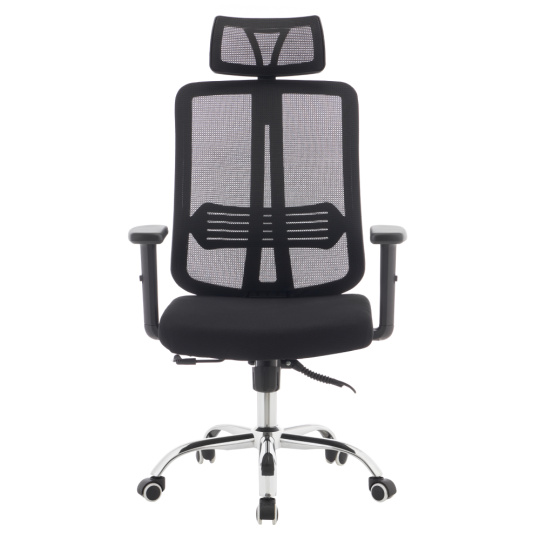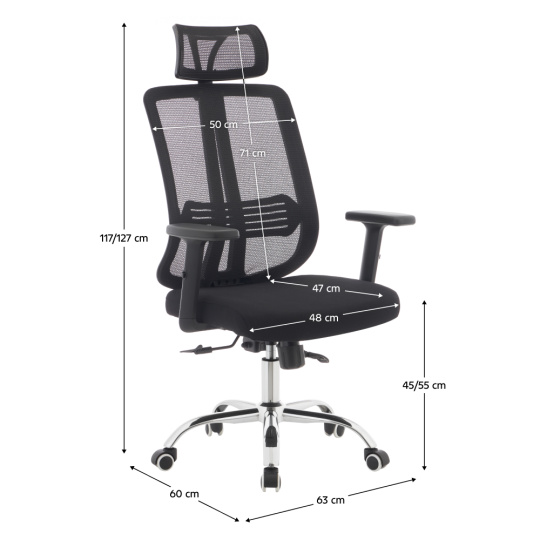 Materiál: síťovina/látka/plast/kov Oděruodolnost síťoviny podle testu Martindale: 90 000 oděrů Oděruodolnost textilie podle testu Martindale: 80 000 oděrů Barva: černá/chrom Rozměry (ŠxHxV): 63x60x117-127 cm Výška sedu: 45-55 cm Hloubka sedu: 47 cm Šířka sedu: 48 cm Šířka zádové opěrky: 50 cm Výška zádové opěrky: 71 cm Nosnost: 150 kg Otočná funkce Funkce houpání Nastavitelná výška sedu Nastavitelná výška opěrek na ruce S opěrkou hlavy Univerzální kolečka Kolečka jsou vhodná pro měkké i tvrdé podlahy Praktická Ergonomické vlastnosti Dodáváno v demontu