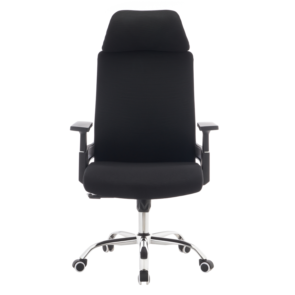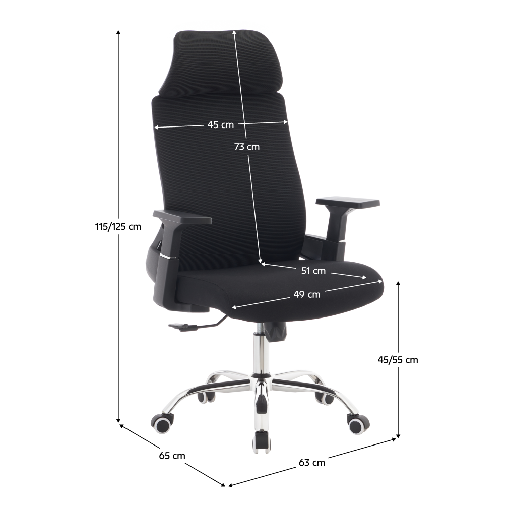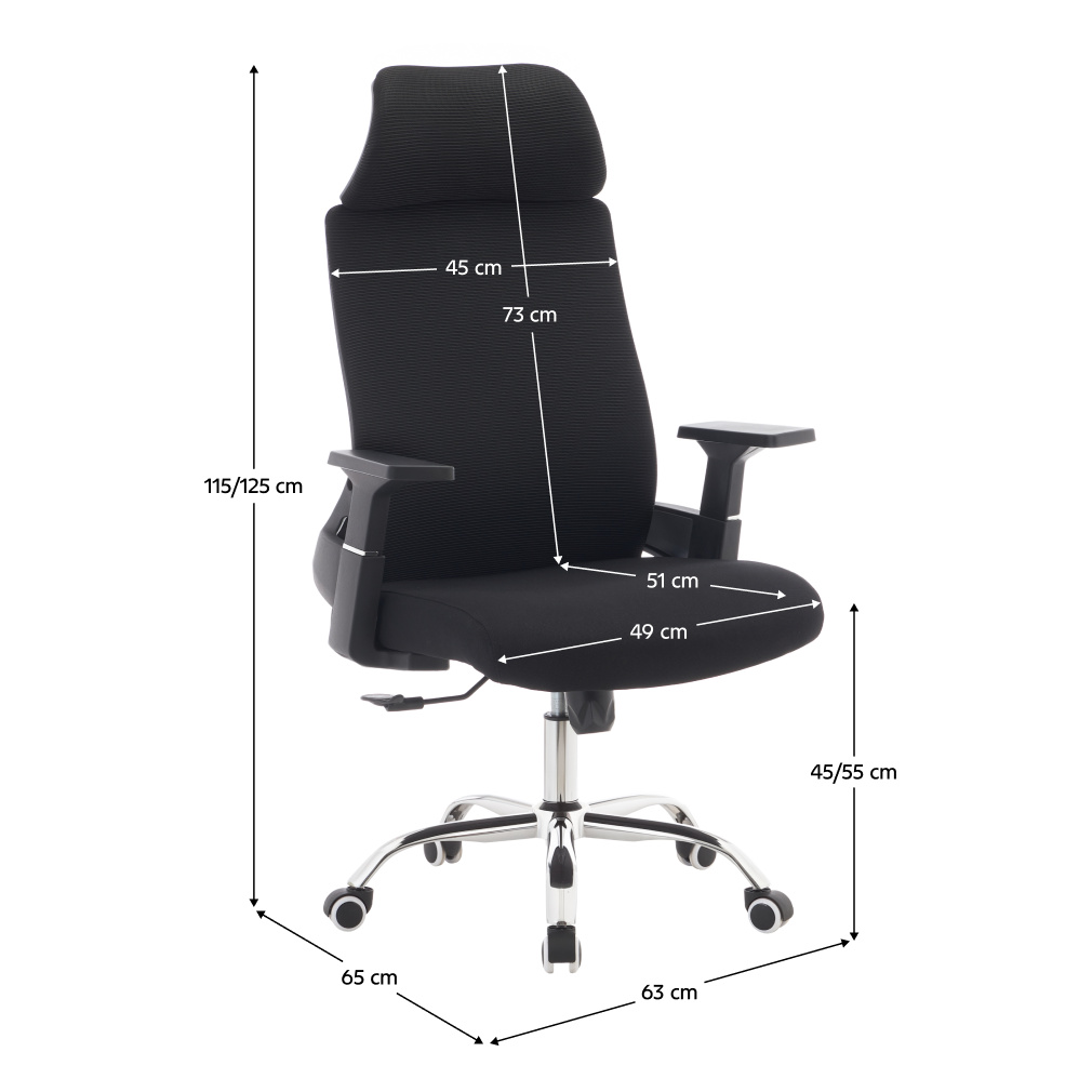 Materiál: síťovina/látka/plast/kov Oděruodolnost síťoviny podle testu Martindale: 90 000 oděrů Oděruodolnost textilie podle testu Martindale: 80 000 oděrů Barva: černá/chrom Rozměry (ŠxHxV): 63x65x115-125 cm Výška sedu: 45-55 cm Hloubka sedu: 51 cm Šířka sedu: 49 cm Šířka zádové opěrky: 45 cm Výška zádové opěrky: 73 cm Nosnost: 150 kg Otočná židle Mechanismus houpání Nastavitelná výška sedu S opěrkami na ruce S opěrkou hlavy Univerzální kolečka Vhodné pro měkké i tvrdé podlahy Dodáváno v demontu