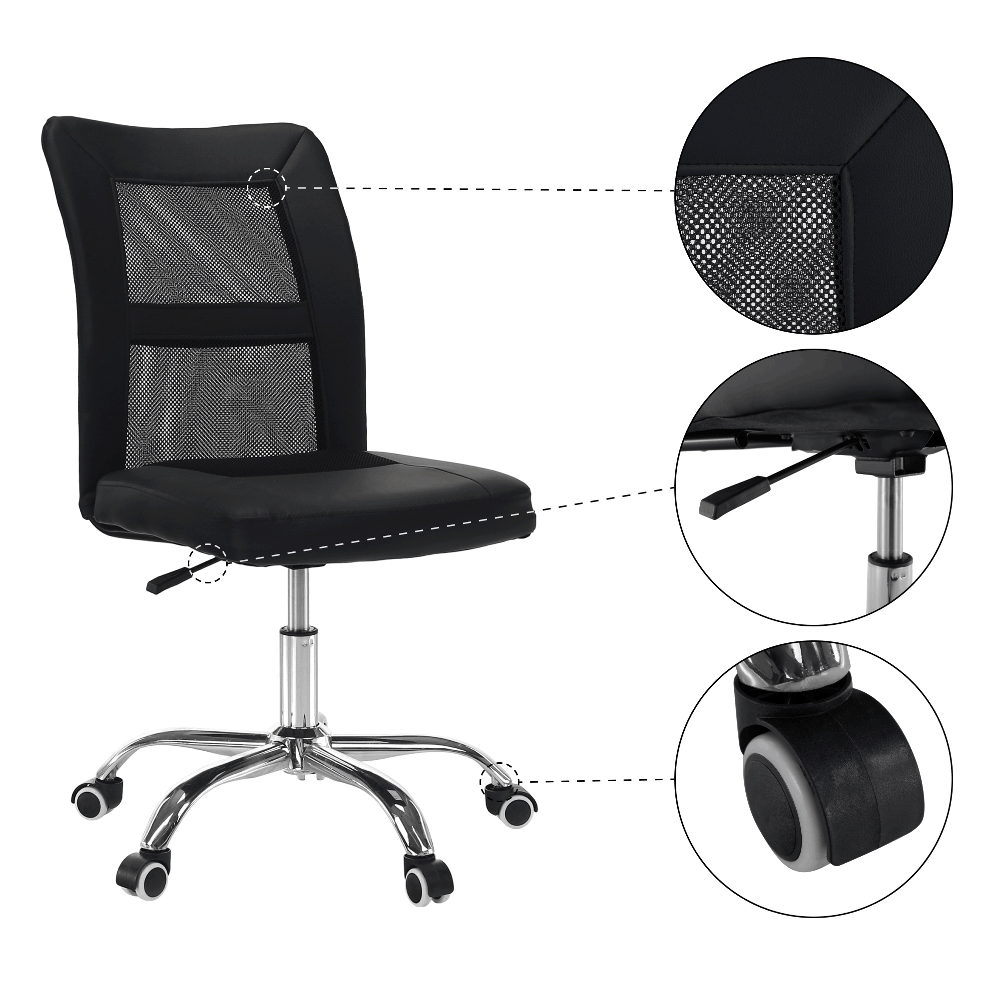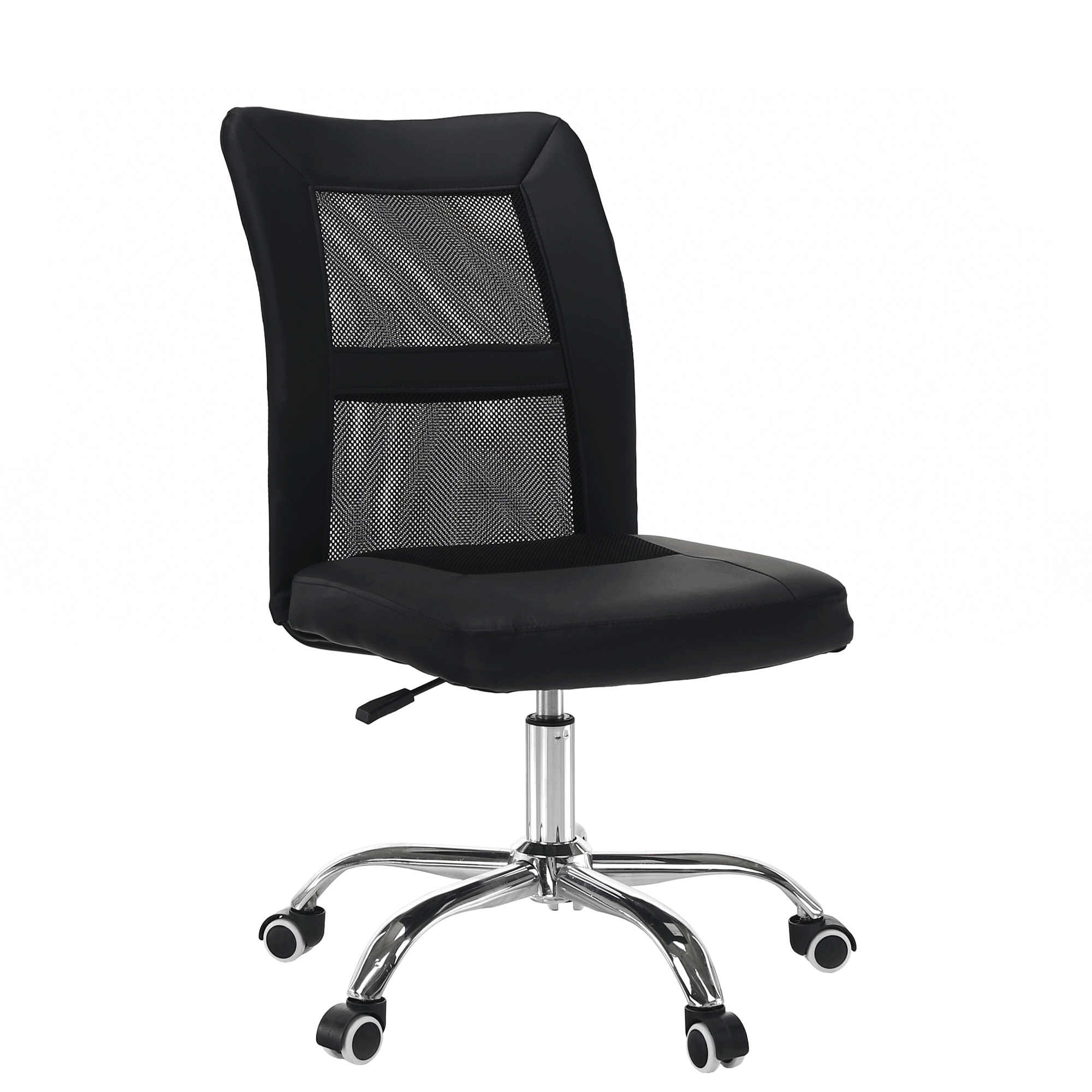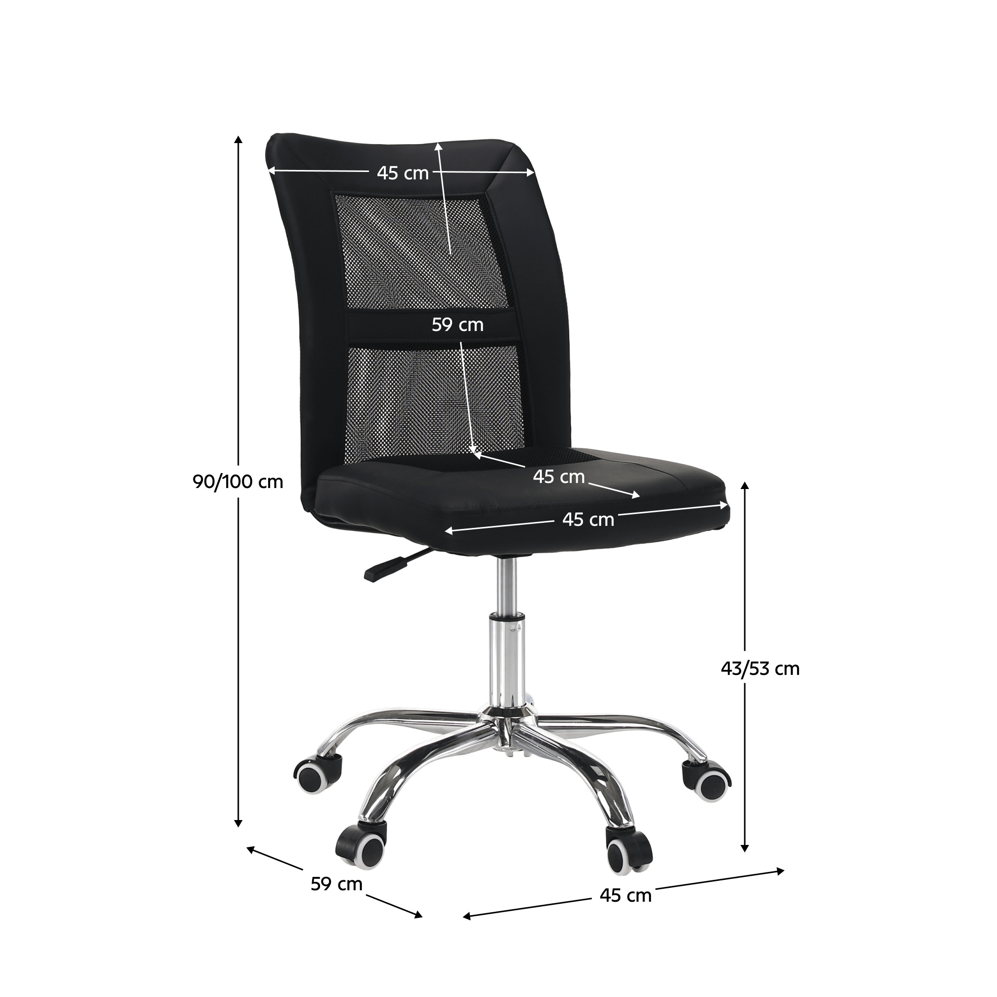 Provedení: černá/chrom Materiál: síťovina/ekokůže/chrom Oděruodolnost textilie podle testu Martindale: 100 000 oděrů Oděruodolnost textilie podle testu Martindale: 90 000 oděrů Rozměry (ŠxHxV): 45x59x90-100 cm Výška sedu: 43-53 cm Hloubka sedu: 45 cm Šířka sedu: 45 cm Výška zádové opěrky: 59 cm Šířka zádové opěrky: 45 cm Nosnost: 110 kg Na kolečkách Nastavitelná výška sedu Otáčivá Dodáváno v demontu