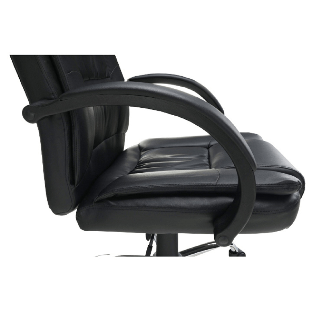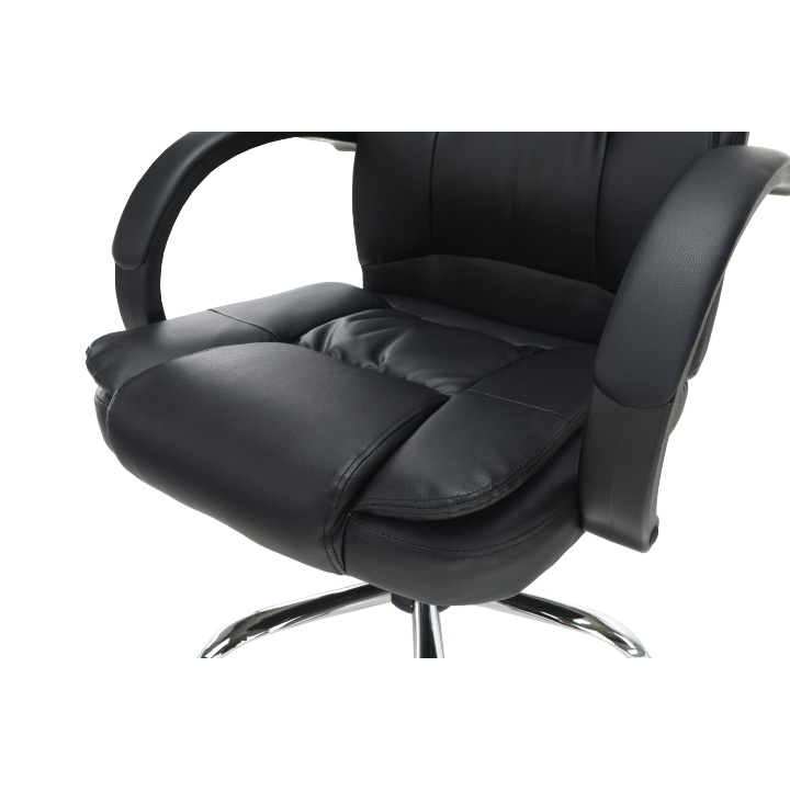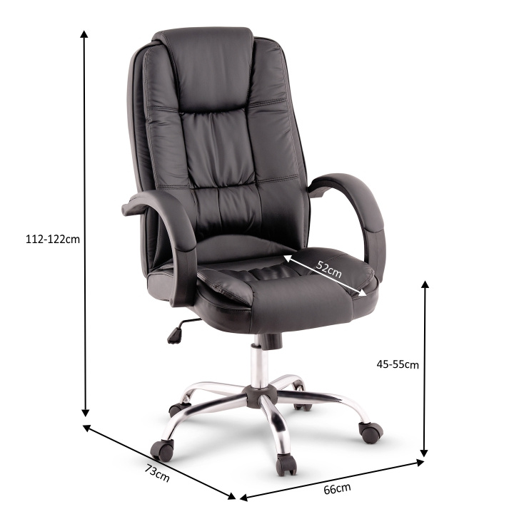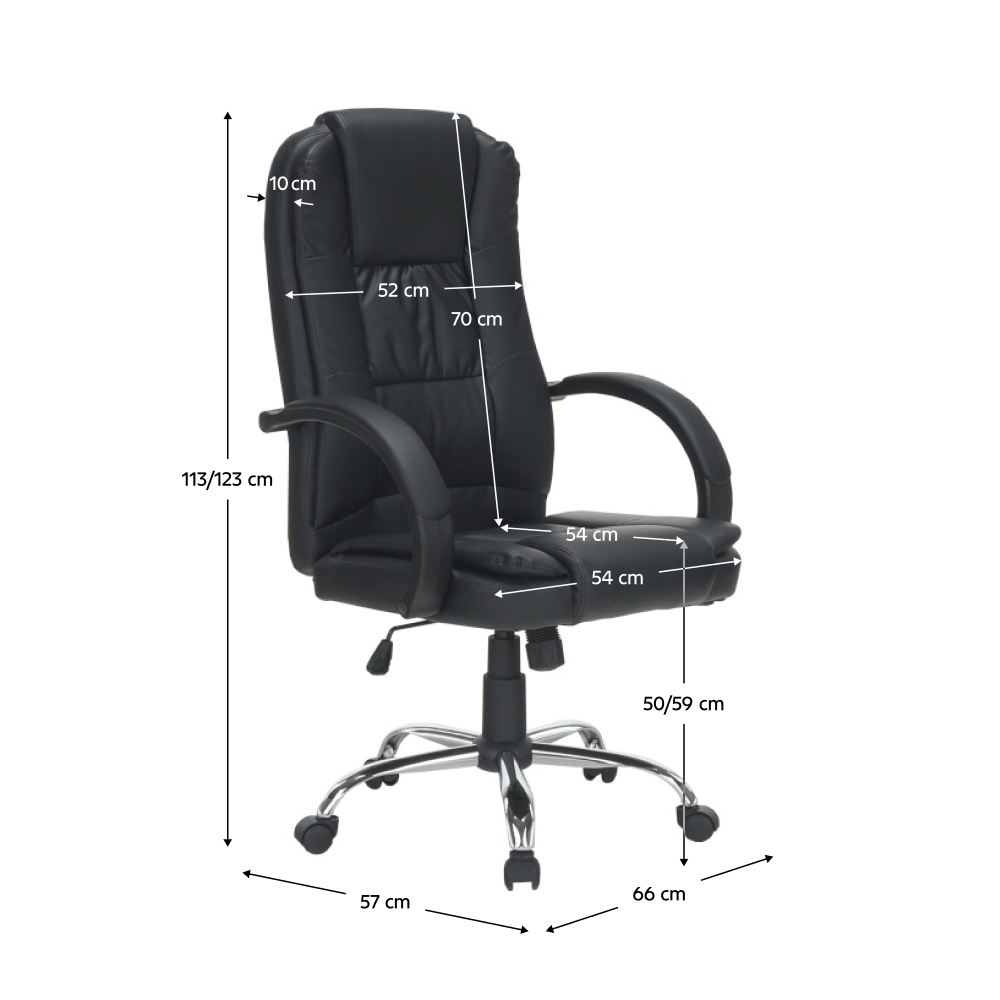Materiál: ekokůže/kov/plast Oděruodolnost ekokůže podle testu Martindale: 100 000 oděrů Barva: černá/chrom Rozměry (ŠxHxV): 66x57x113-123 cm Výška sedu: 50-59 cm Hloubka sedu: 54 cm Nosnost: 130 kg Opěrka zad (ŠxV): 52x70 cm Sedák (ŠxH): 54x54 cm Možnost nastavit výšku sedu Funkce houpání Kovová růžice Plastové opěrky na ruce Opěrky na ruce čalouněné Dodáváno v demontu
