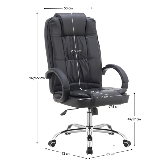 Materiál: ekokůže/kov/plast Oděruodolnost ekokůže podle testu Martindale: 100 000 oděrů Barva: černá/chrom Rozměry (ŠxHxV): 65x73x112-122 cm Výška sedu: 49-57 cm Hloubka sedu: 52 cm Šířka sedu: 52 cm Šířka zádové opěrky: 50 cm Výška zádové opěrky: 71,5 cm Nosnost: 130 kg Hmotnost: 15,9 kg Nastavitelná výška sedu S opěrkami na ruce Plastové opěrky na ruce Opěrky jsou čalouněné Otočné Mechanismus houpání Univerzální kolečka Vhodné pro tvrdé i měkké podlahy Pětiramenná podstava Dodáváno v demontu