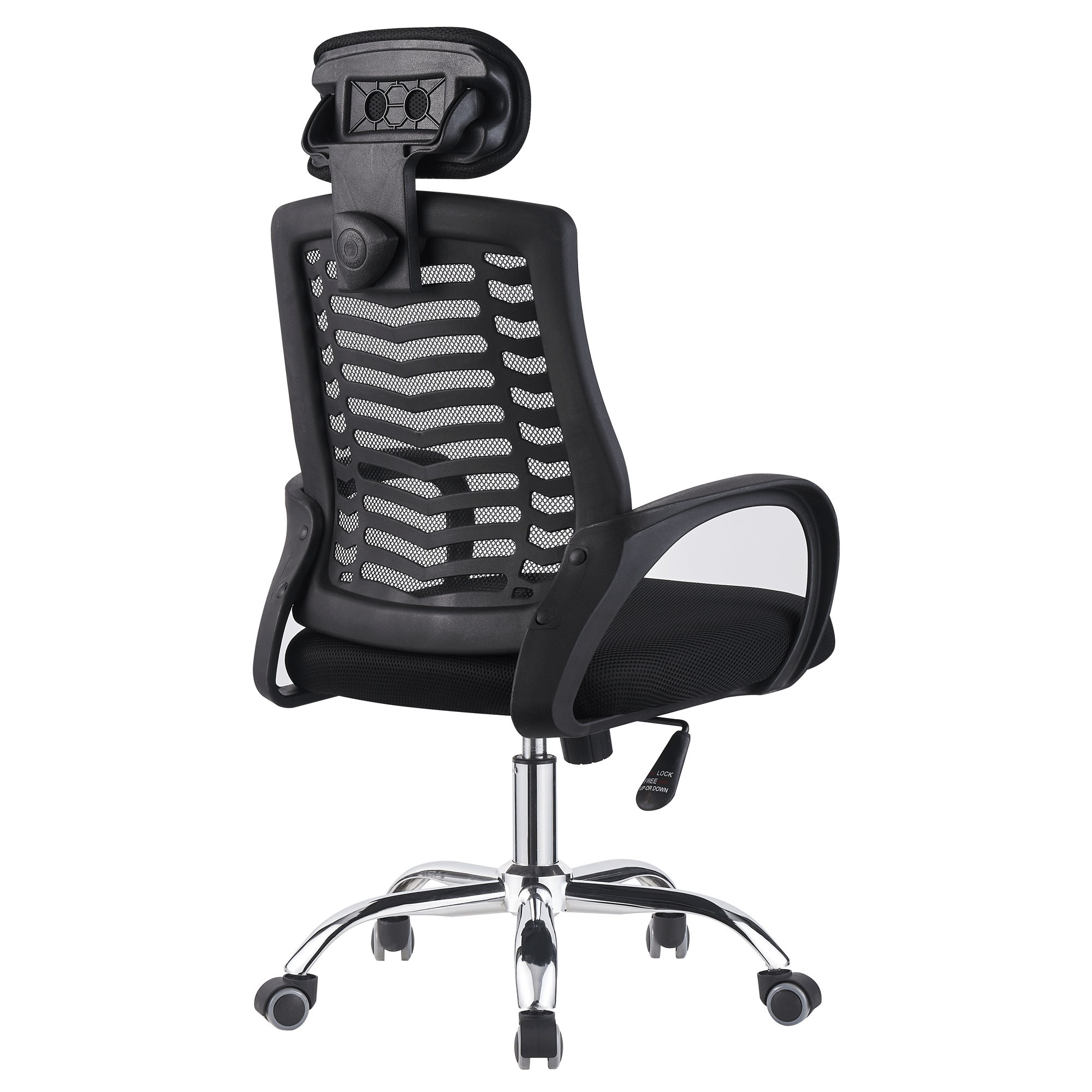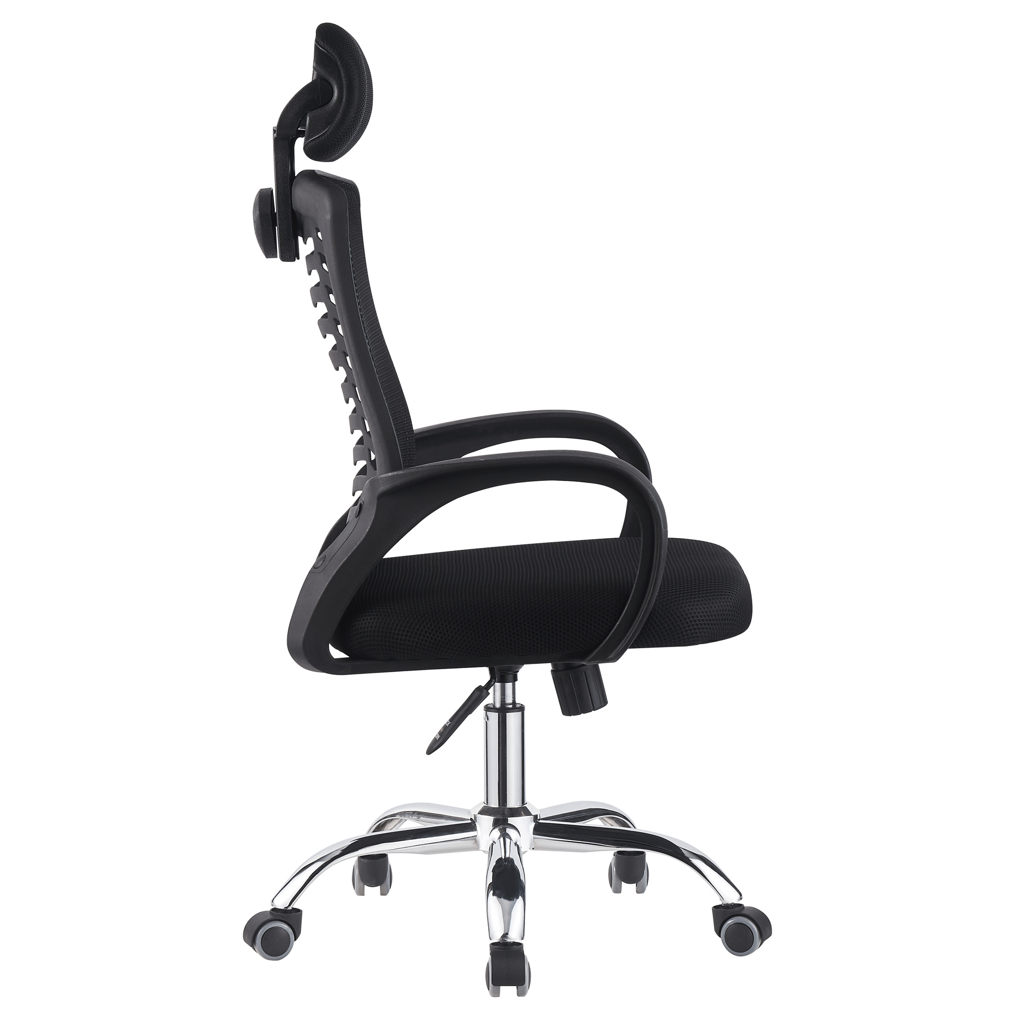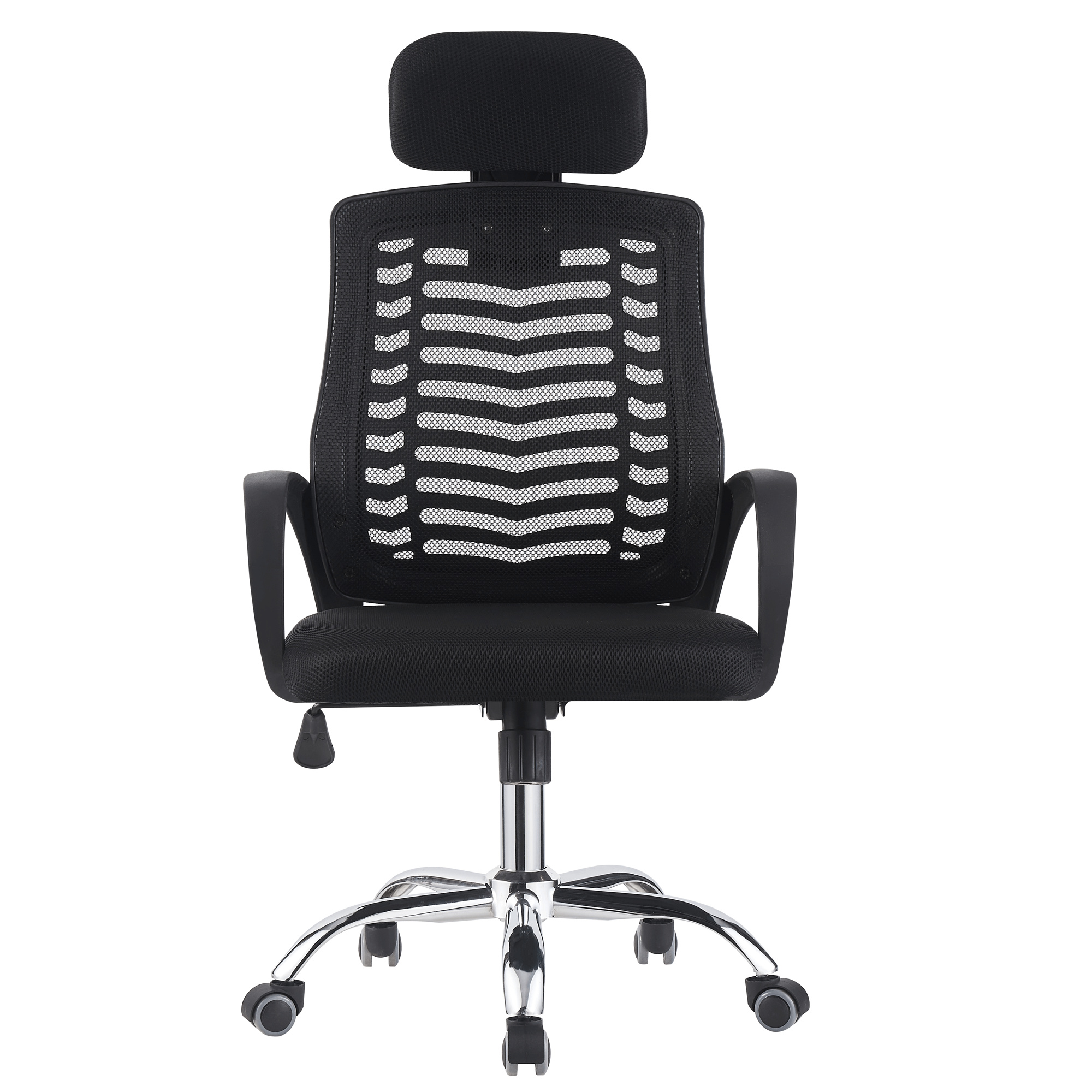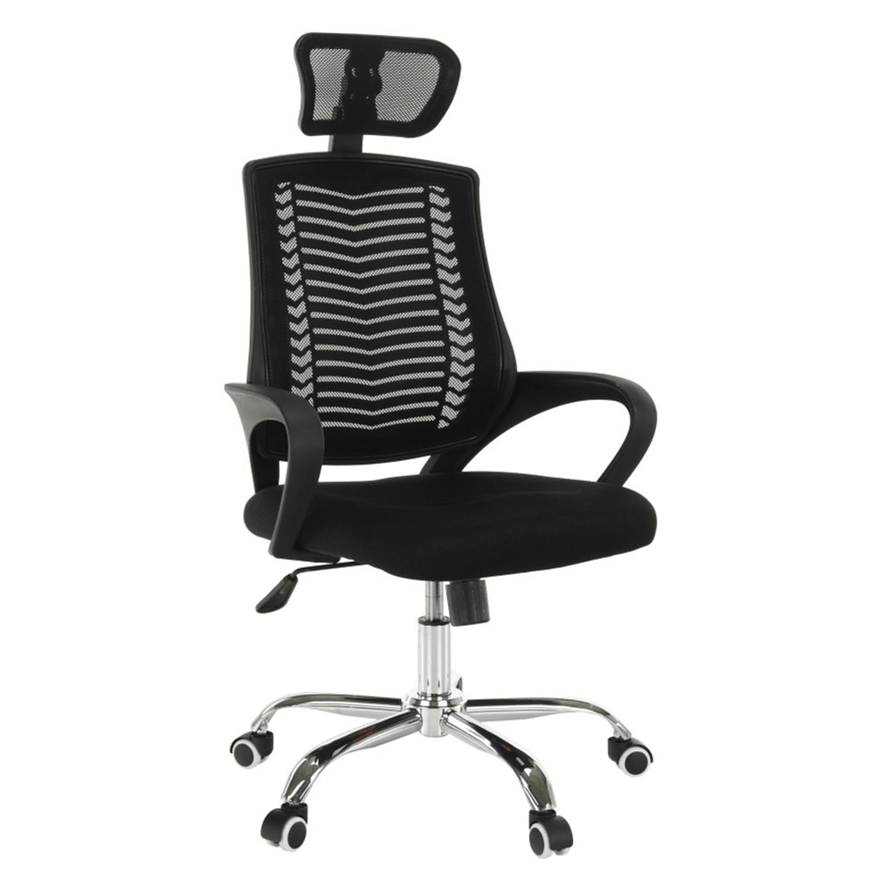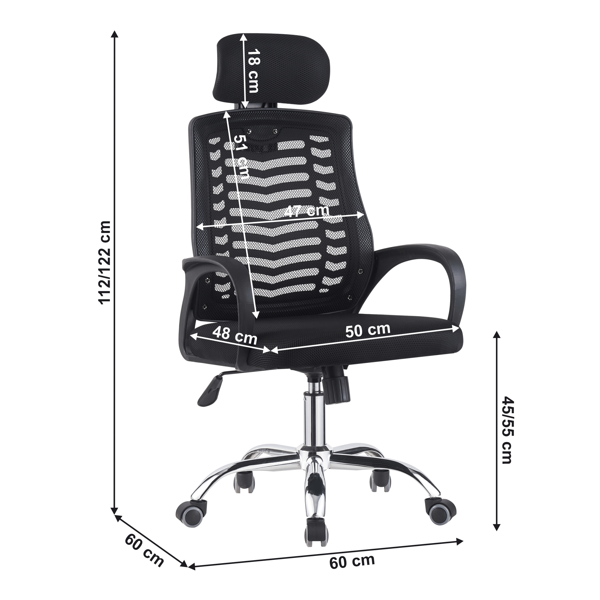 Materiál čalounění: síťovina Oděruodolnost textilie podle testu Martindale: 90 000 oděrů Barva: černá Materiál konstrukce: plast/kov Barva: černá/chromová povrchová úprava Rozměry (ŠxHxV): 60x60x112-122 cm Výška sedu: 45-55 cm Hloubka sedu: 48 cm Šířka sedu: 50 cm Výška zádové opěrky: 51 cm Šířka zádové opěrky: 47 cm Výška zádové opěrky s opěrkou hlavy: 69 cm Nosnost: 100 kg Univerzální kolečka Kolečka vhodná pro měkké i tvrdé podlahy Mechanismus houpání Pěticípá růžice S nastavitelnou opěrkou hlavy Plastové opěrky na ruce Dodáváno v demontu