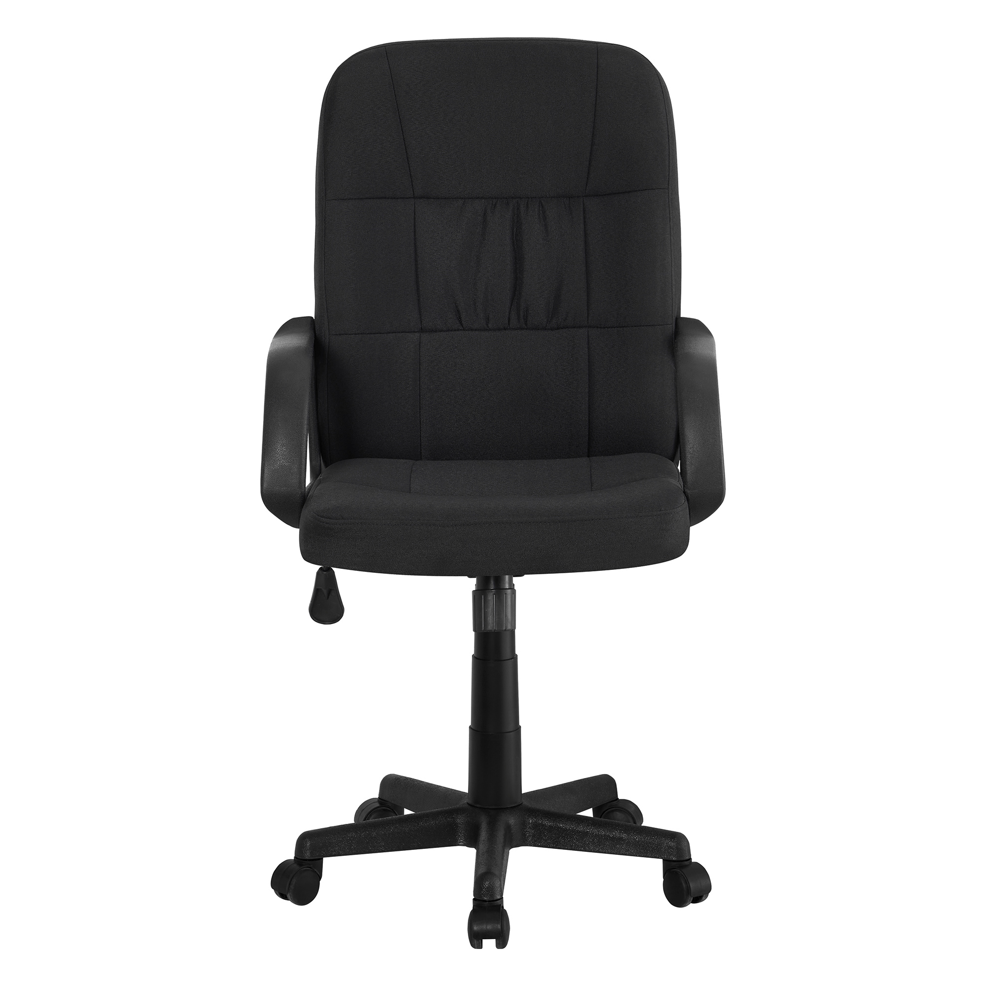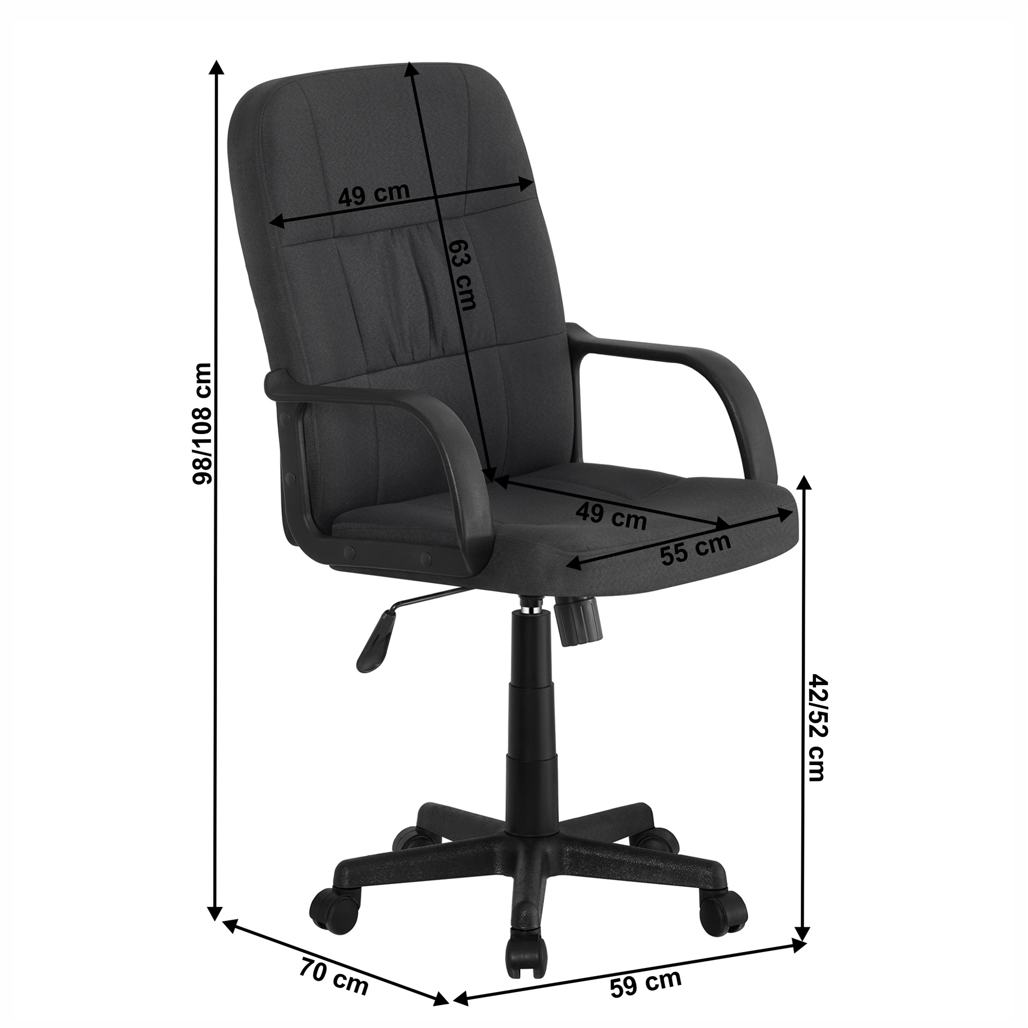 Kancelářské křeslo KERET Materiál: látka/plast Oděruodolnost textilie podle testu Martindale: 60 000 oděrů Barva: černá Rozměry (ŠxHxV): 59x70x98-108 cm Nastavitelná výška sedu: 42-52 cm Hloubka sedu: 49 cm Nosnost: 110 kg Opěrka zad (ŠxV): 49x63 cm Sedák (ŠxH): 55x49 cm Nastavení výšky sedu Mechanismus houpání Plastové opěrky na ruce i spodní růžice Dodáváno v demontu