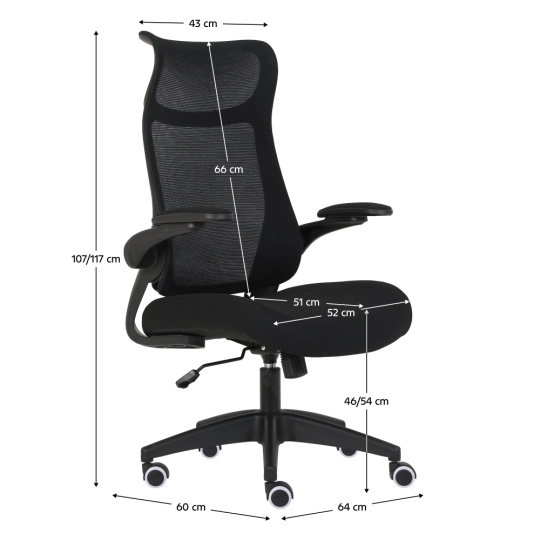 Materiál: síťovina/plast Oděruodolnost textilie podle testu Martindale: 90 000 oděrů Barva: černá Rozměry (ŠxHxV): 64x60x107-117 cm Výška sedu: 46-54 cm Šířka sedu: 52 cm Hloubka sedu: 51 cm Výška zádové opěrky: 66 cm Šířka zádové opěrky: 43 cm Nosnost: 110 kg Hmotnost: 11,5 kg Nastavitelná výška sedu S opěrkami na ruce Područky s funkcí sklopení Otočné Mechanismus houpání Univerzální kolečka Vhodné pro tvrdé i měkké podlahy Pětiramenná podstava Dodáváno v demontu