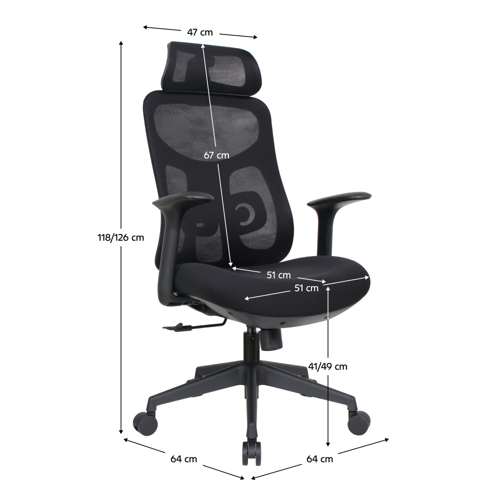 Materiál: síťovina/plast Oděruodolnost textilie podle testu Martindale: 90 000 oděrů Barva: černá Rozměry (ŠxHxV): 64x64x118-126 cm Výška sedu: 41-49 cm Hloubka sedu: 51 cm Šířka sedu: 51 cm Šířka zádové opěrky: 47 cm Výška zádové opěrky: 67 cm Nosnost: 150 kg Otočná židle Mechanismus houpání Nastavitelná opěrka hlavy Nastavitelná výška sedu S opěrkami na ruce Ergonomická bederní opěrka s možností nastavení výšky Tvarované sedátko Dodáváno v demontu